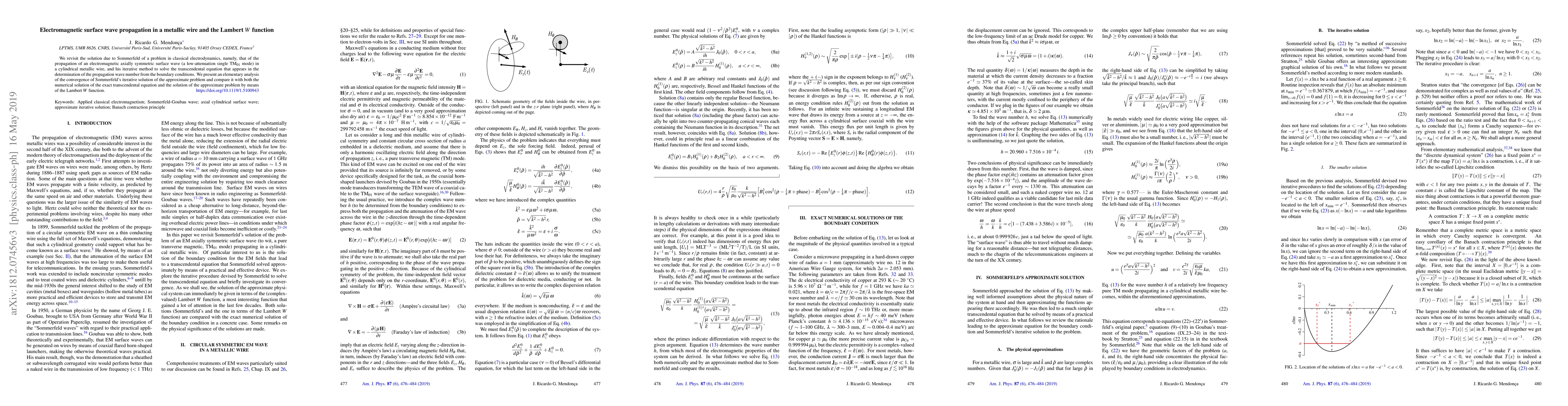 We revisit the solution due to Sommerfeld of a problem in classical electrodynamics, namely, that of the propagation of an electromagnetic axially symmetric surface wave (a low-attenuation single TM$_{01}$ mode) in a cylindrical metallic wire, and his iterative method to solve the transcendental equation that appears in the determination of the propagation wave number from the boundary conditions. We present an elementary analysis of the convergence of Sommerfeld's iterative solution of the approximate problem and compare it with both the numerical solution of the exact transcendental equation and the solution of the approximate problem by means of the Lambert $W$ function.