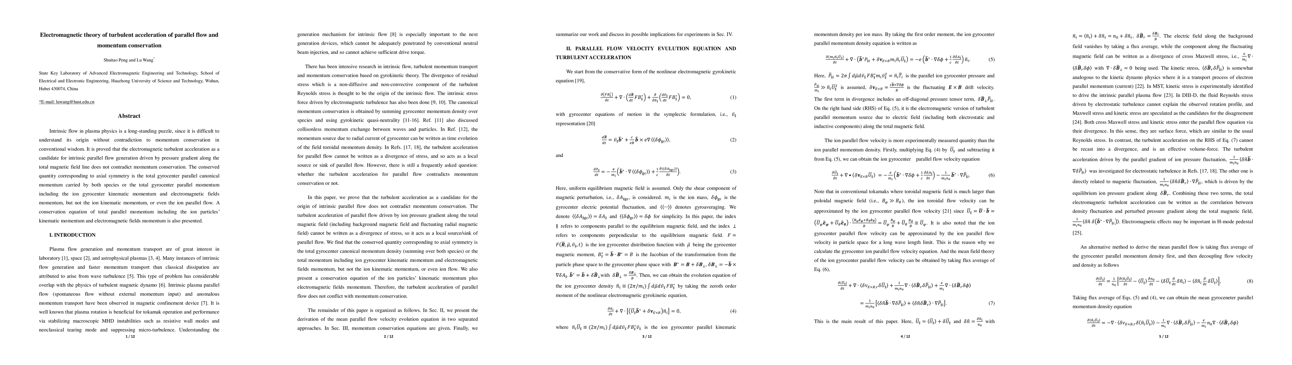 This paper demonstrates that electromagnetic turbulent acceleration can generate intrinsic parallel flow in plasma physics without violating momentum conservation, proposing that the total gyrocenter parallel canonical momentum is conserved, rather than the ion kinematic momentum. A conservation equation for total parallel momentum, encompassing both ion particles' kinematic momentum and electromagnetic fields momentum, is introduced.