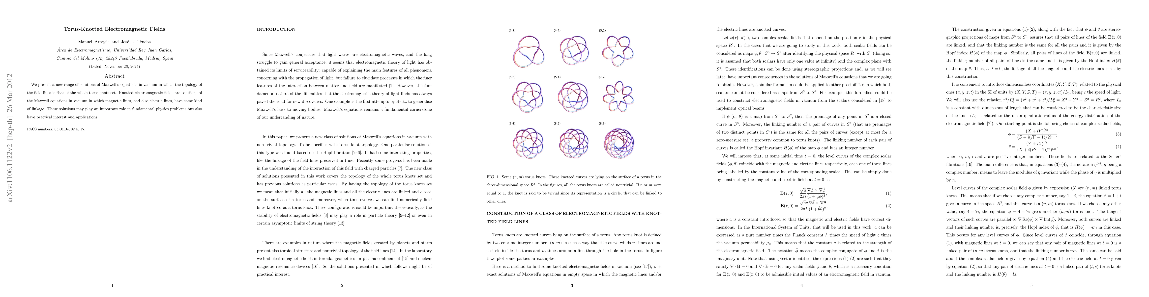 We present a new range of solutions of the Maxwell equations in vacuum in which the topology of the field lines is that of the whole torus knots set. Knotted electromagnetic fields are solutions of the Maxwell equations in vacuum in which magnetic lines, and also electric lines, have some kind of linkage. These solutions may play an important role in fundamental physics problems from the stability of field configurations, such as plasma confinement, to coding information.