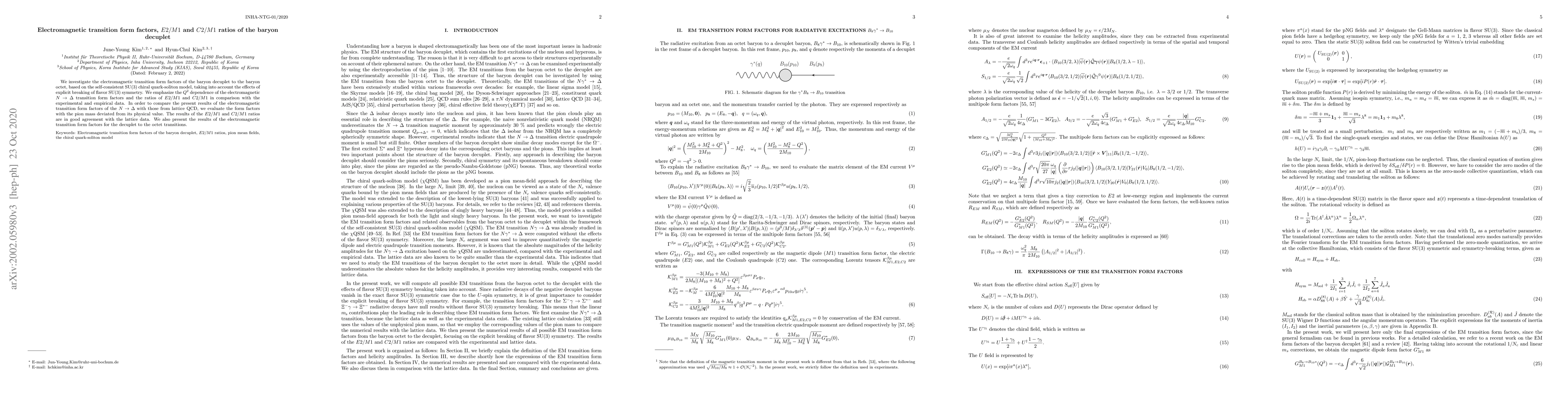 This paper investigates the electromagnetic transition form factors of the baryon decuplet to the octet using the SU(3) chiral quark-soliton model, focusing on the $N\to \Delta$ transition and the $E2/M1$ and $C2/M1$ ratios. The results show good agreement with lattice QCD data and experimental data.
