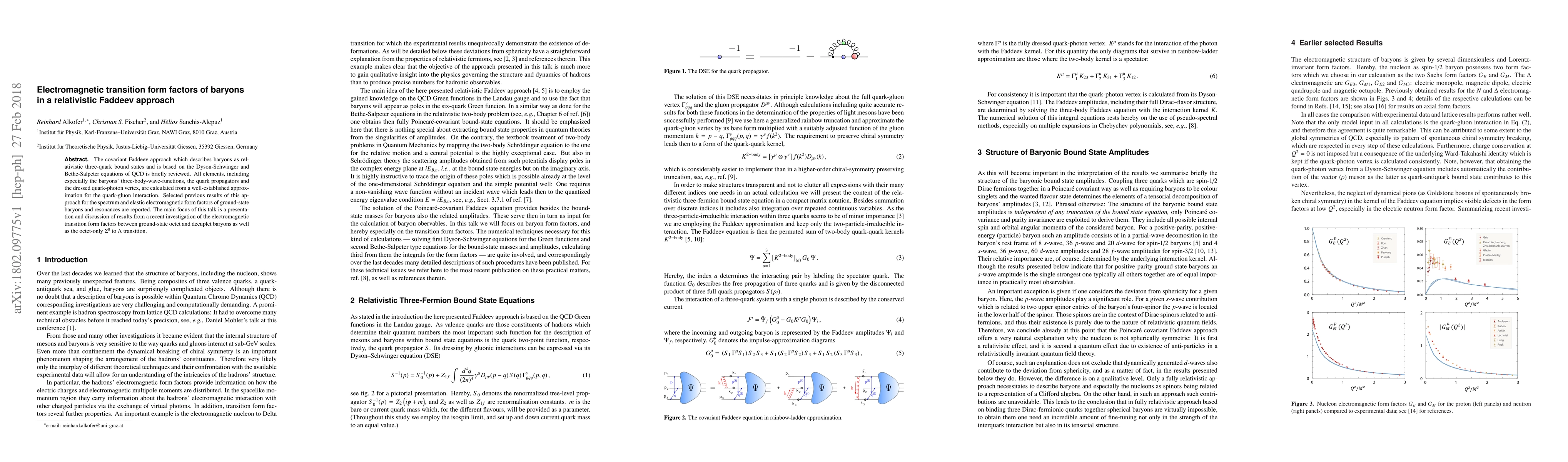 The covariant Faddeev approach which describes baryons as relativistic three-quark bound states and is based on the Dyson-Schwinger and Bethe-Salpeter equations of QCD is briefly reviewed. All elements, including especially the baryons' three-body-wave-functions, the quark propagators and the dressed quark-photon vertex, are calculated from a well-established approximation for the quark-gluon interaction. Selected previous results of this approach for the spectrum and elastic electromagnetic form factors of ground-state baryons and resonances are reported. The main focus of this talk is a presentation and discussion of results from a recent investigation of the electromagnetic transition form factors between ground-state octet and decuplet baryons as well as the octet-only $\Sigma^0$ to $\Lambda$ transition.