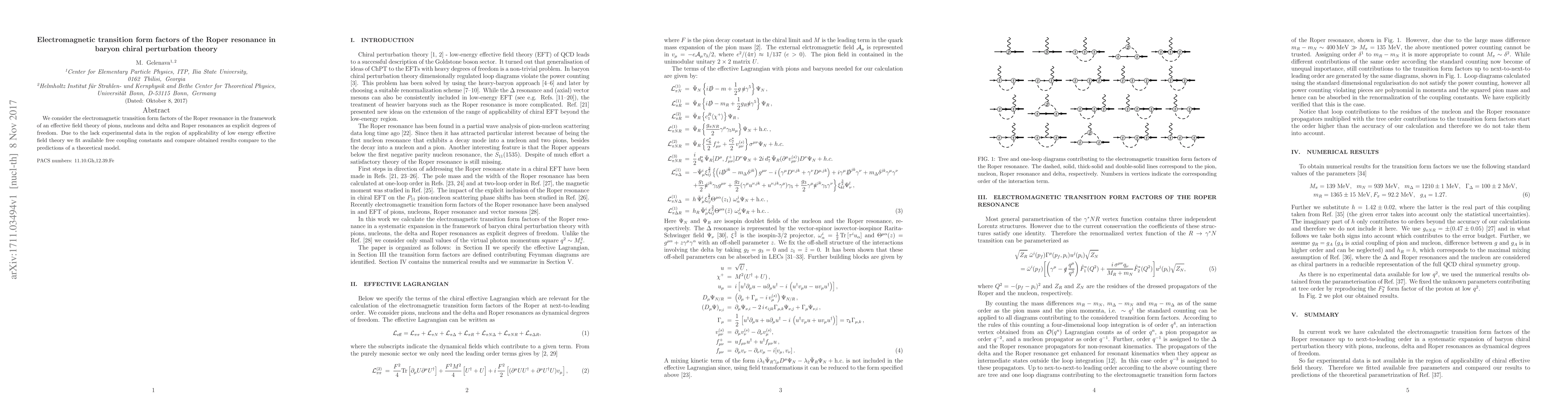 This paper investigates the electromagnetic transition form factors of the Roper resonance using baryon chiral perturbation theory, fitting free coupling constants due to limited experimental data and comparing results with theoretical models. The study employs an effective field theory framework that includes pions, nucleons, delta, and Roper resonances.