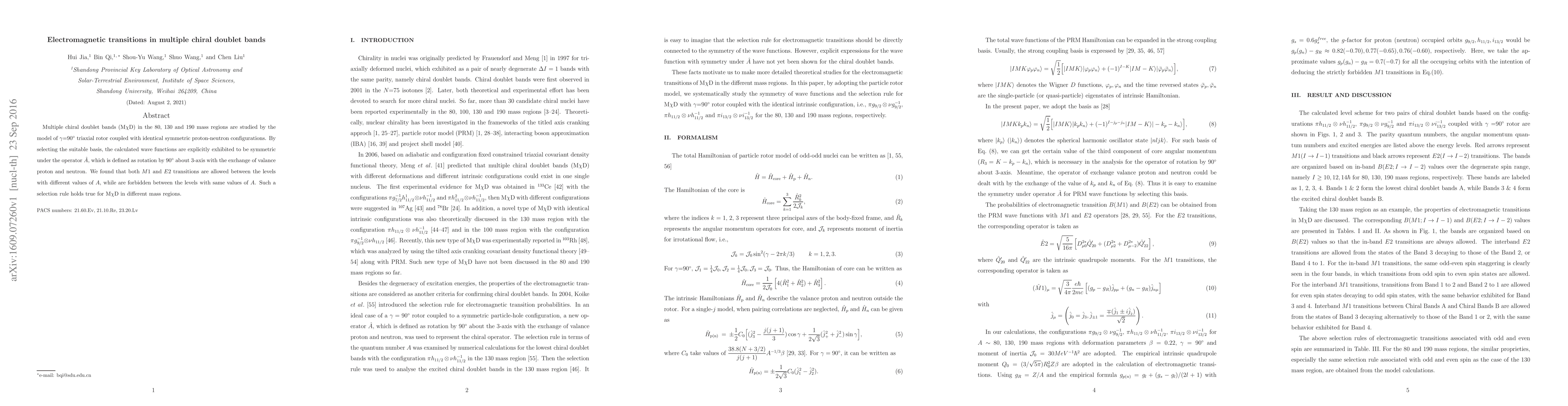 This study investigates Multiple Chiral Doublet Bands (Mu03c7D) in the 80, 130, and 190 mass regions using a model of a u03c0=90u00b0 triaxial rotor coupled with symmetric proton-neutron configurations. The model's wave functions are shown to be symmetric under a 90u00b0 rotation about the 3-axis exchanging valence proton and neutron. It's found that Mu03c7D allows M1 and E2 transitions between levels with different A values, but forbids them between levels with the same A values, a rule applicable across different mass regions.