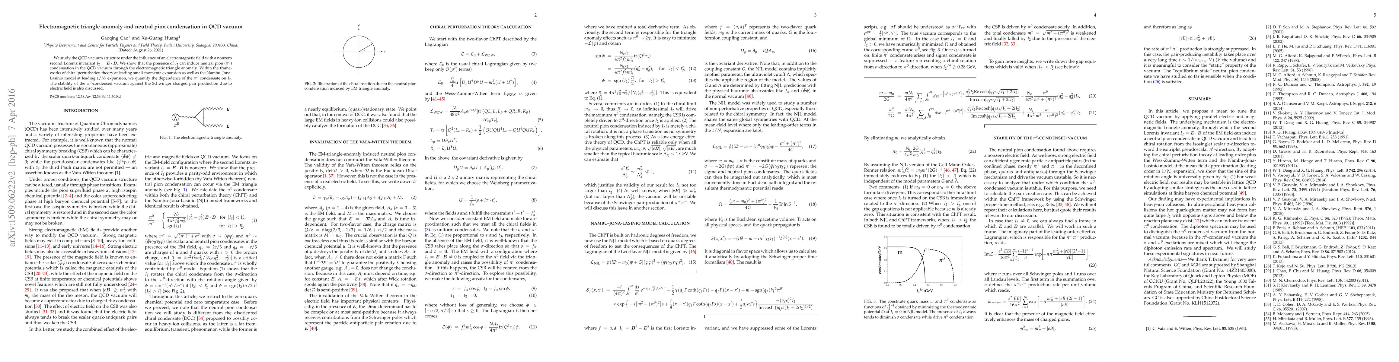 This paper investigates how a nonzero second Lorentz invariant $I_2=\vec{E}\cdot{\vec B}$ can induce neutral pion ($\pi^0$) condensation in the QCD vacuum via electromagnetic triangle anomaly. It uses chiral perturbation theory and the Nambu--Jona-Lasinio model to quantify this effect and discusses the stability of the $\pi^0$-condensed vacuum against Schwinger pair production.