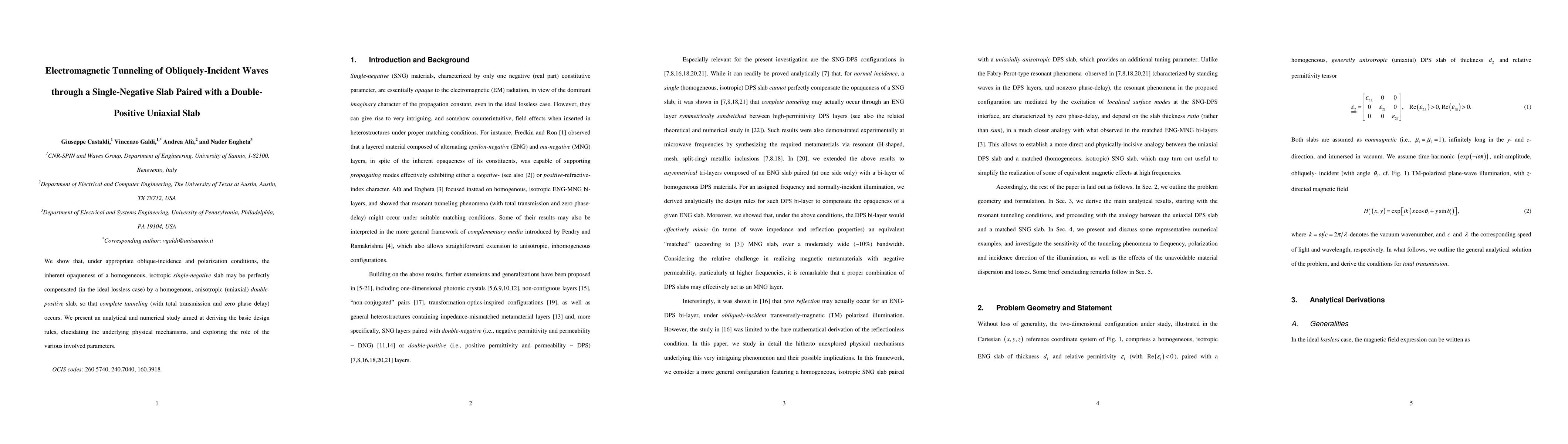 This paper demonstrates that under specific oblique-incidence and polarization conditions, a single-negative slab can achieve perfect electromagnetic tunneling when paired with a uniaxial double-positive slab, resulting in complete transmission without phase delay. The study provides analytical and numerical insights into the design principles and physical mechanisms governing this phenomenon.