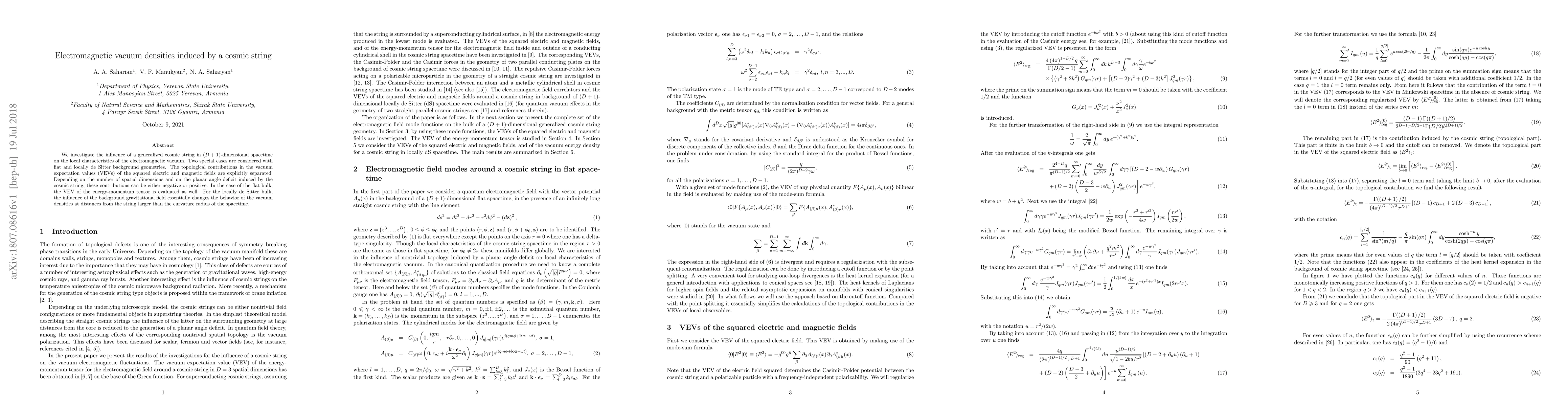 This paper examines how a generalized cosmic string in (D+1)-dimensional spacetime affects the electromagnetic vacuum, considering both flat and locally de Sitter geometries. It separates topological contributions in the vacuum expectation values of squared electric and magnetic fields, revealing that the contributions can be either positive or negative depending on spatial dimensions and the string's angle deficit. The study also evaluates the energy-momentum tensor in flat space and notes the altered behavior of vacuum densities in de Sitter space due to gravitational background effects.