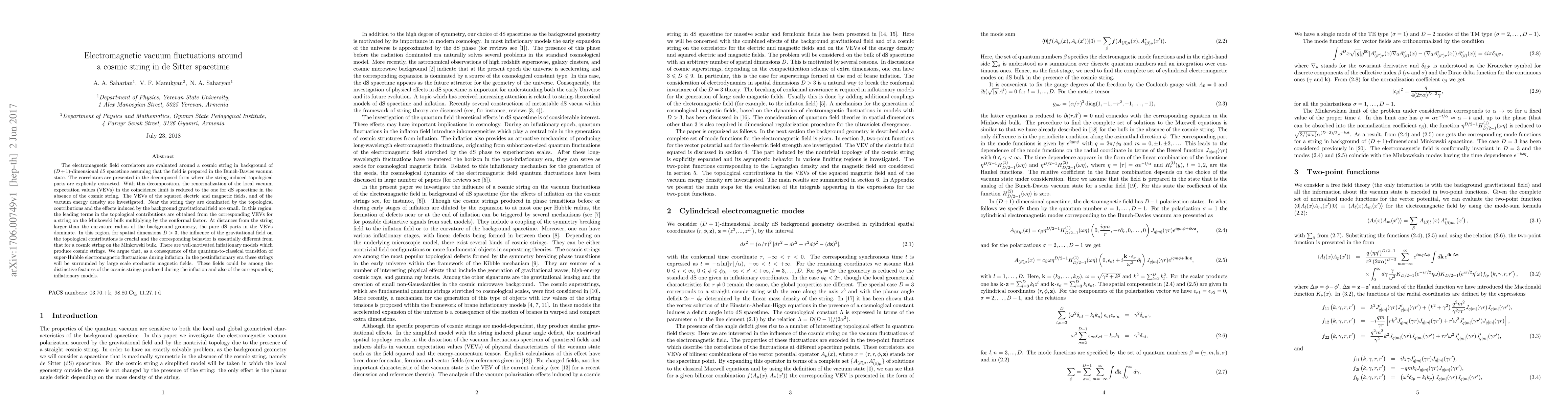 The electromagnetic field correlators are evaluated around a cosmic string in background of $(D+1)$-dimensional dS spacetime assuming that the field is prepared in the Bunch-Davies vacuum state. The correlators are presented in the decomposed form where the string-induced topological parts are explicitly extracted. With this decomposition, the renormalization of the local vacuum expectation values (VEVs) in the coincidence limit is reduced to the one for dS spacetime in the absence of the cosmic string. The VEVs of the squared electric and magnetic fields, and of the vacuum energy density are investigated. Near the string they are dominated by the topological contributions and the effects induced by the background gravitational field are small. In this region, the leading terms in the topological contributions are obtained from the corresponding VEVs for a string on the Minkowski bulk multiplying by the conformal factor. At distances from the string larger than the curvature radius of the background geometry, the pure dS parts in the VEVs dominate. In this region, for spatial dimensions $D>3$, the influence of the gravitational field on the topological contributions is crucial and the corresponding behavior is essentially different from that for a cosmic string on the Minkowski bulk. There are well-motivated inflationary models which produce cosmic strings. We argue that, as a consequence of the quantum-to-classical transition of super-Hubble electromagnetic fluctuations during inflation, in the postinflationary era these strings will be surrounded by large scale stochastic magnetic fields. These fields could be among the distinctive features of the cosmic strings produced during the inflation and also of the corresponding inflationary models.