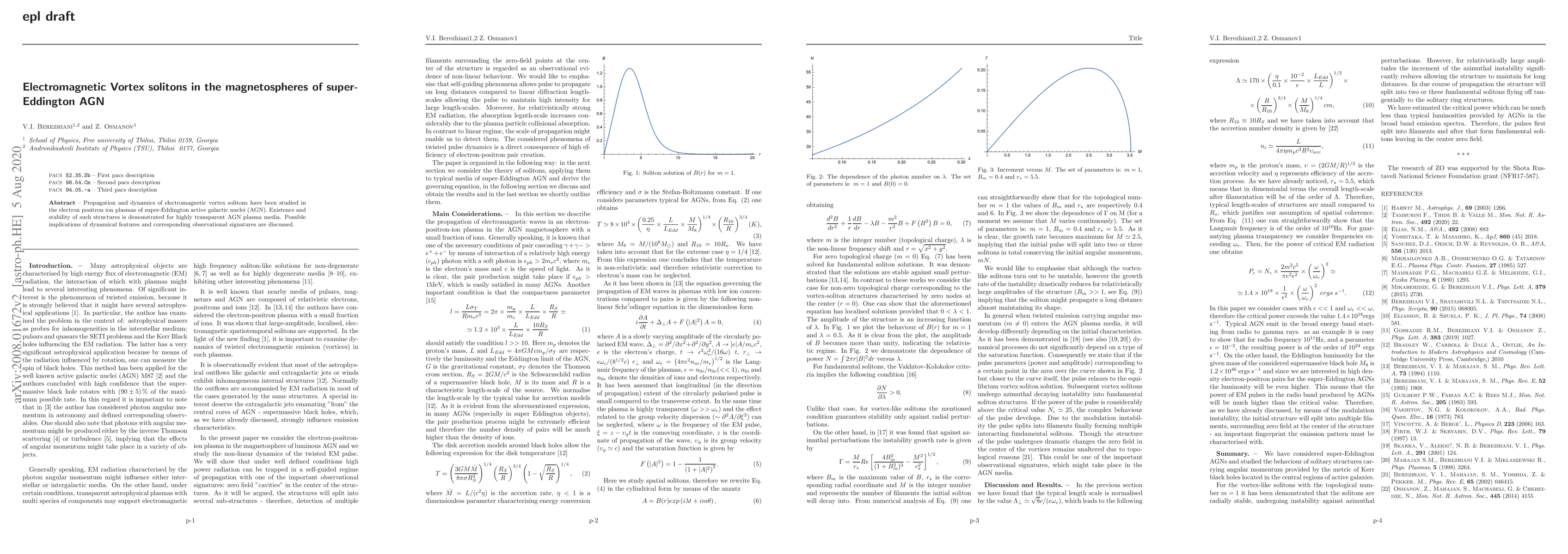Propagation and dynamics of electromagnetic vortex solitons have been studied in the electron positron ion plasmas of super-Eddington active galactic nuclei (AGN). Existence and stability of such structures is demonstrated for highly transparent AGN plasma media. Possible implications of dynamical features and corresponding observational signatures are discussed.
