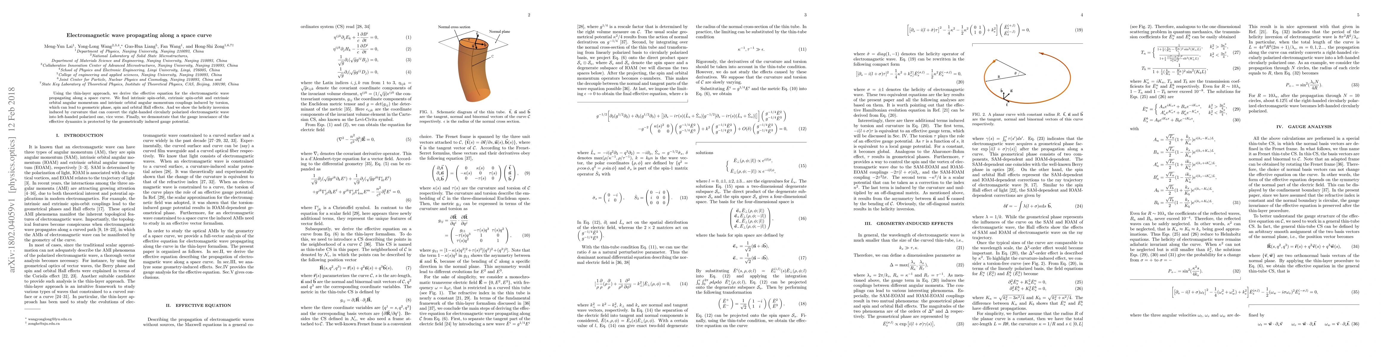Using the thin-layer approach, we derive the effective equation for the electromagnetic wave propagating along a space curve. We find intrinsic spin-orbit, extrinsic spin-orbit and extrinsic orbital angular momentum and intrinsic orbital angular momentum couplings induced by torsion, which can lead to geometric phase, spin and orbital Hall effects. And we show the helicity inversion induced by curvature that can convert the right-handed circularly polarized electromagnetic wave into left-handed polarized one, vice verse. Finally, we demonstrate that the gauge invariance of the effective dynamics is protected by the geometrically induced gauge potential.