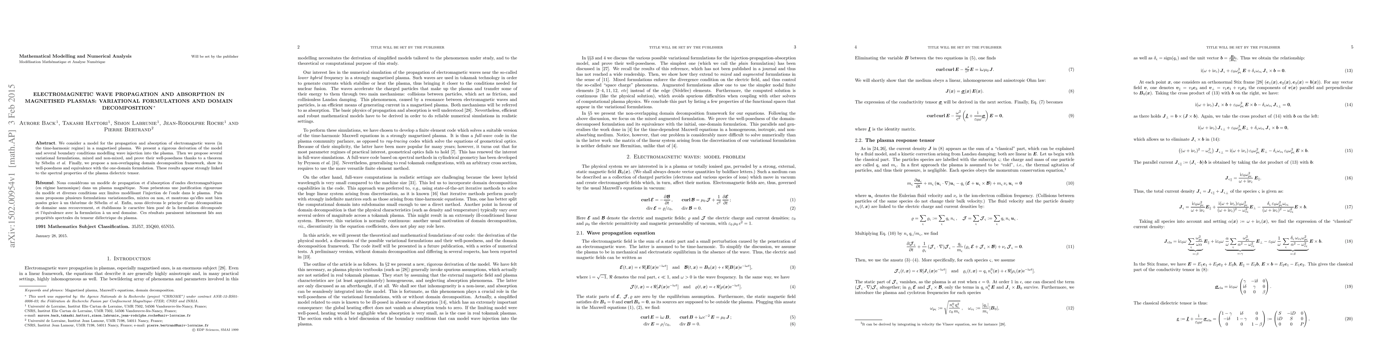 This paper develops a rigorous model for electromagnetic wave propagation and absorption in magnetised plasmas, presenting variational formulations and proving their well-posedness. It also introduces a non-overlapping domain decomposition framework, demonstrating its equivalence with the one-domain formulation and linking these results to the spectral properties of the plasma dielectric tensor.