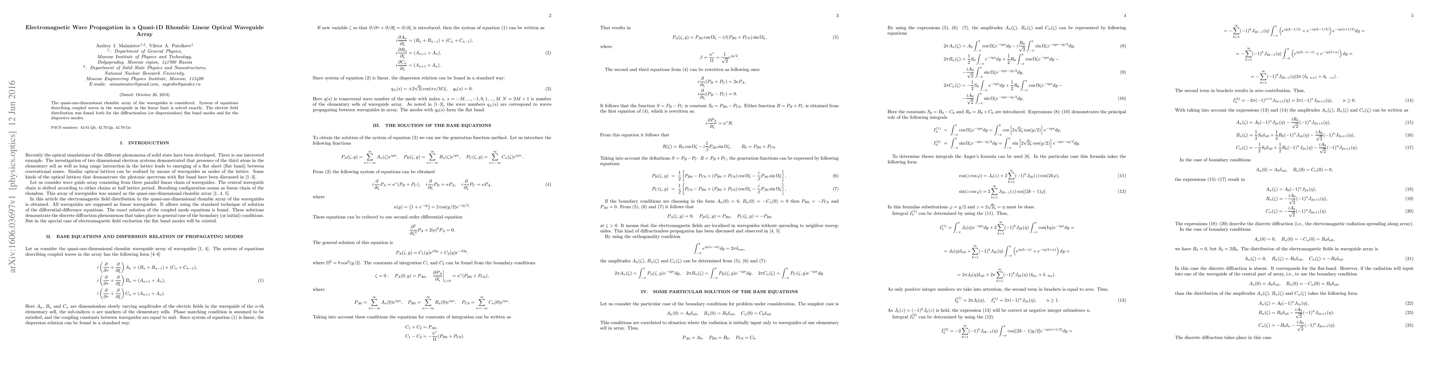 This paper investigates electromagnetic wave propagation in a quasi-1D rhombic waveguide array, solving the exact system of equations for coupled waves. It presents the electric field distribution for both diffractionless flat band modes and dispersive modes.