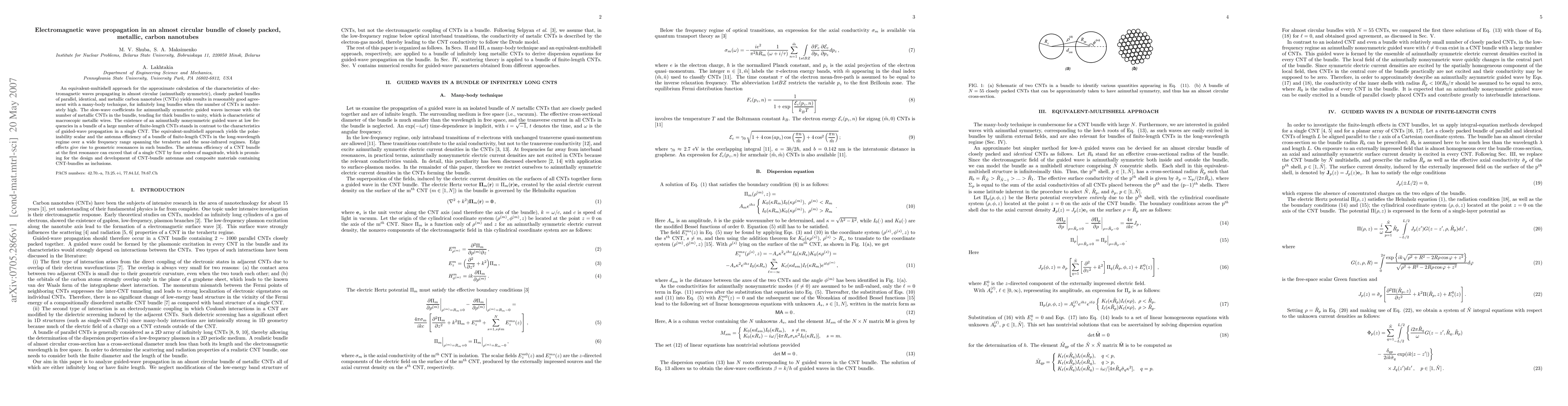 An equivalent-multishell approach for the approximate calculation of the characteristics of electromagnetic waves propagating in almost circular (azimuthally symmetric), closely packed bundles of parallel, identical, and metallic carbon nanotubes (CNTs) yields results in reasonably good agreement with a many-body technique, for infinitely long bundles when the number of CNTs is moderately high. The slow-wave coefficients for azimunthally symmetric guided waves increase with the number of metallic CNTs in the bundle, tending for thick bundles to unity, which is characteristic of macroscopic metallic wires. The existence of an azimuthally nonsymmetric guided wave at low frequencies in a bundle of a large number of finite-length CNTs stands in contrast to the characteristics of guided-wave propagation in a single CNT. The equivalent-multishell approach yields the polarizability scalar and the antenna efficiency of a bundle of finite-length CNTs in the long-wavelength regime over a wide frequency range spanning the terahertz and the near-infrared regimes. Edge effects give rise to geometric resonances in such bundles. The antenna efficiency of a CNT bundle at the first resonance can exceed that of a single CNT by four orders of magnitude, which is promising for the design and development of CNT-bundle antennas and composite materials containing CNT-bundles as inclusions.
