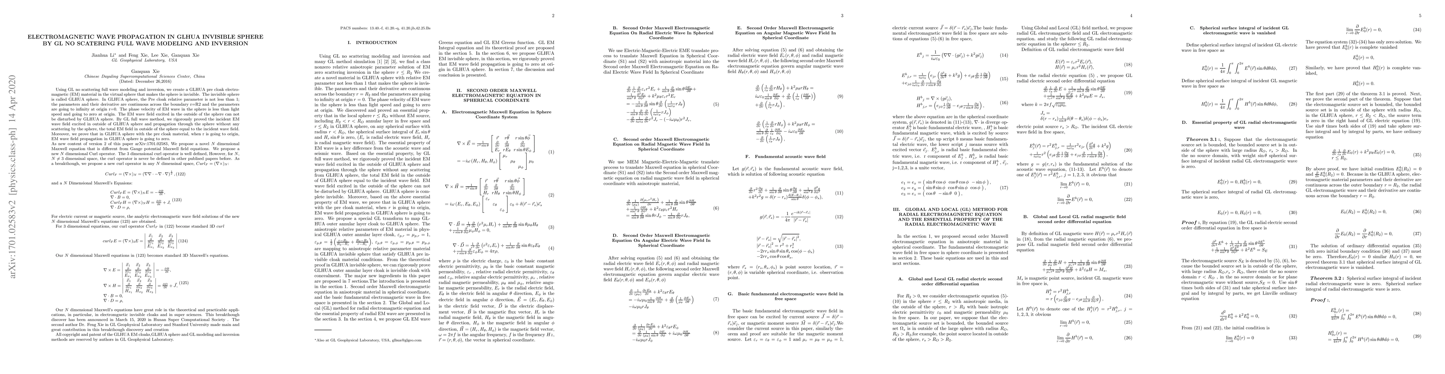 Using GL no scattering full wave modeling and inversion, we create a GLHUA pre cloak electromagnetic (EM) material in the virtual sphere that makes the sphere is invisible. The invisible sphere is called GLHUA sphere. In GLHUA sphere, the Pre cloak relative parameter is not less than 1; the parameters and their derivative are continuous across the boundary r=R2 and the parameters are going to infinity at origin r=0. The phase velocity of EM wave in the sphere is less than light speed and going to zero at origin. The EM wave field excited in the outside of the sphere can not be disturbed by GLHUA sphere. By GL full wave method, we rigorously proved the incident EM wave field excited in outside of GLHUA sphere and propagation through the sphere without any scattering by the sphere, the total EM field in outside of the sphere equal to the incident wave field. Moreover, we prove that in GLHUA sphere with the pre cloak material, when r is going to origin, EM wave field propagation in GLHUA sphere is going to zero. We propose a $N$ dimensional MAXWELL equations. All copyright and patent of the GLHUA EM cloaks,GLHUA sphere and GL modeling and inversion methods are reserved by authors in GL Geophysical Laboratory.