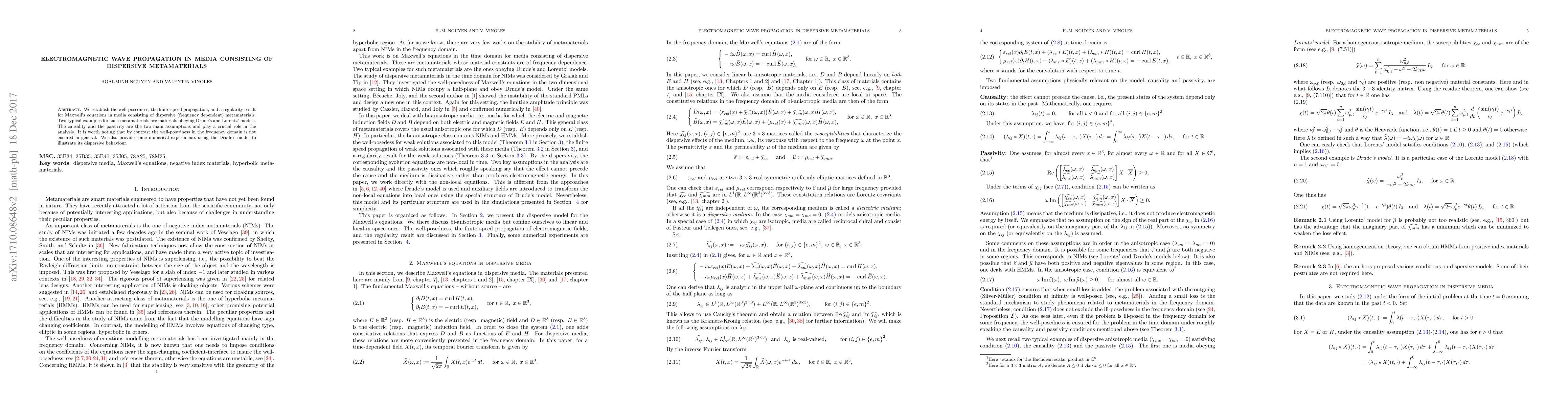 This paper establishes well-posedness, finite speed propagation, and regularity for Maxwell's equations in dispersive metamaterials, focusing on Drude's and Lorentz' models. It highlights the importance of causality and passivity, and includes numerical experiments to demonstrate dispersive behavior.
