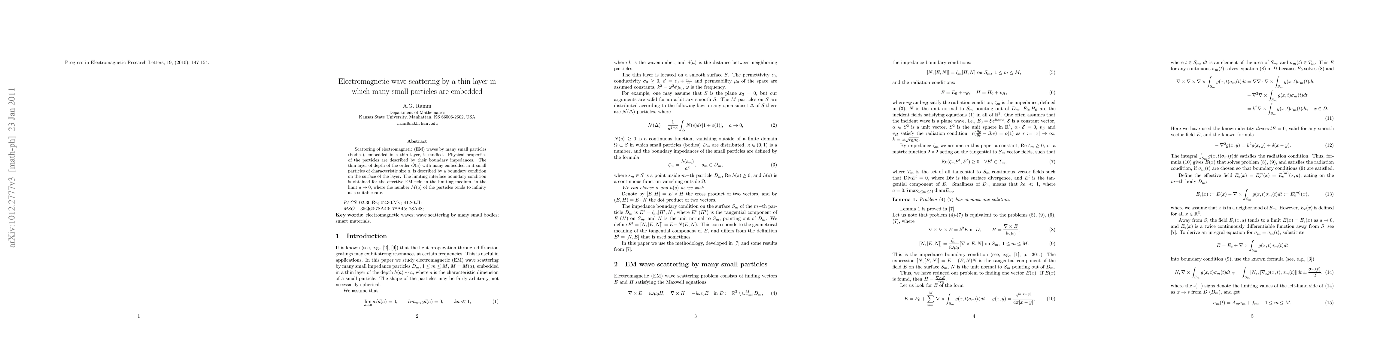 Scattering of electromagnetic (EM) waves by many small particles (bodies), embedded in a thin layer, is studied. Physical properties of the particles are described by their boundary impedances. The thin layer of depth of the order $O(a)$ with many embedded in it small particles of characteristic size $a$, is described by a boundary condition on the surface of the layer. The limiting interface boundary condition is obtained for the effective EM field in the limiting medium, in the limit $a\to 0$, where the number $M(a)$ of the particles tends to infinity at a suitable rate.