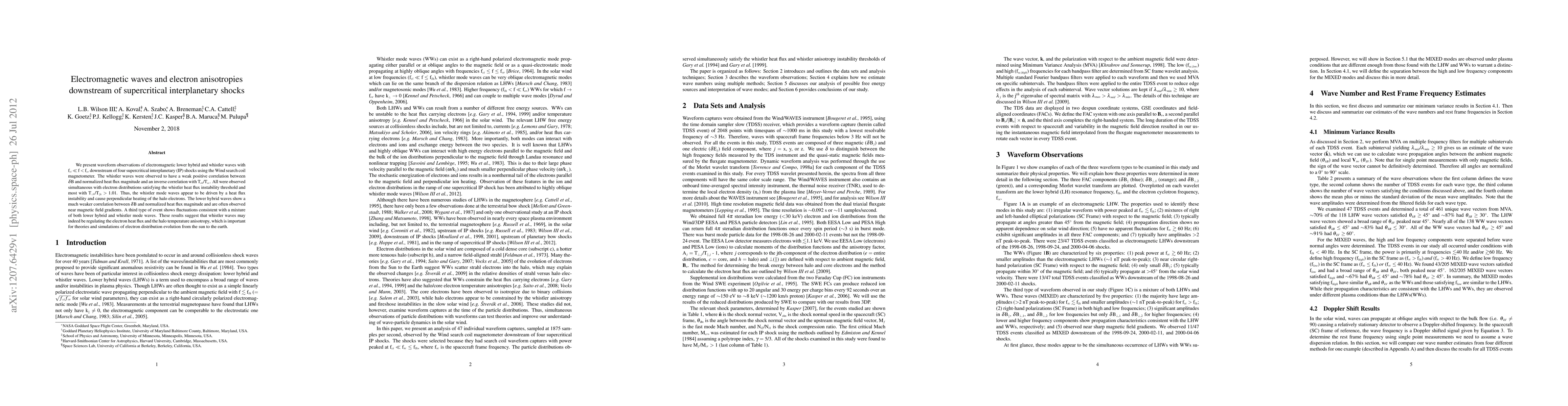 This study observes electromagnetic waves downstream of supercritical interplanetary shocks, finding that whistler waves are driven by heat flux instabilities and contribute to perpendicular heating of halo electrons, while lower hybrid waves show weaker correlation and are often near magnetic field gradients. These findings are crucial for understanding electron distribution evolution from the sun to Earth.
