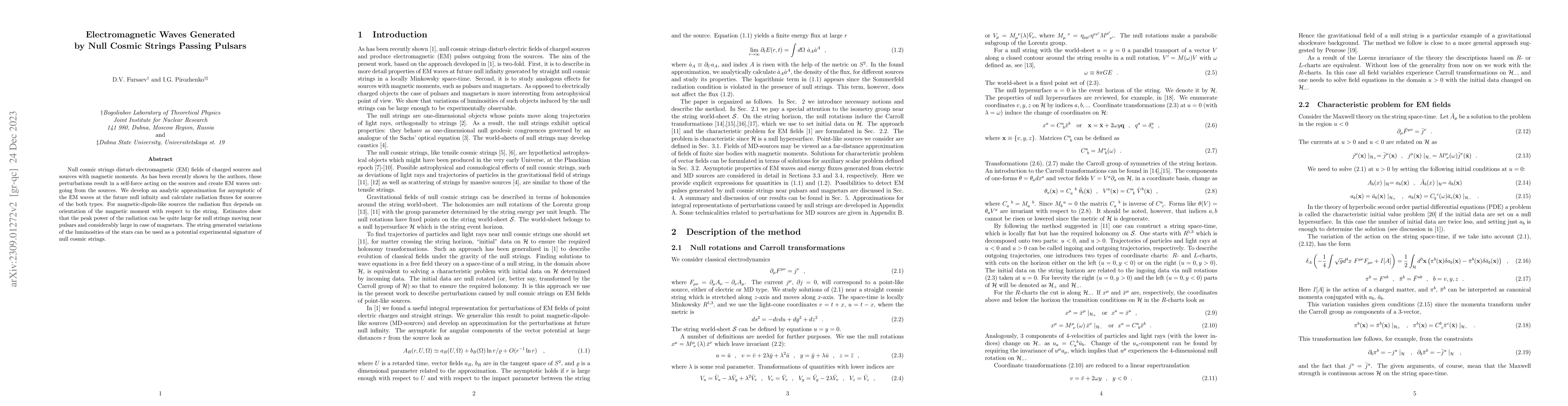 This paper develops an analytic approximation for electromagnetic waves generated by null cosmic strings passing near pulsars and magnetars, showing that the radiation flux depends on the magnetic moment's orientation relative to the string. The study suggests that these variations in luminosity could serve as a potential experimental signature for detecting null cosmic strings.