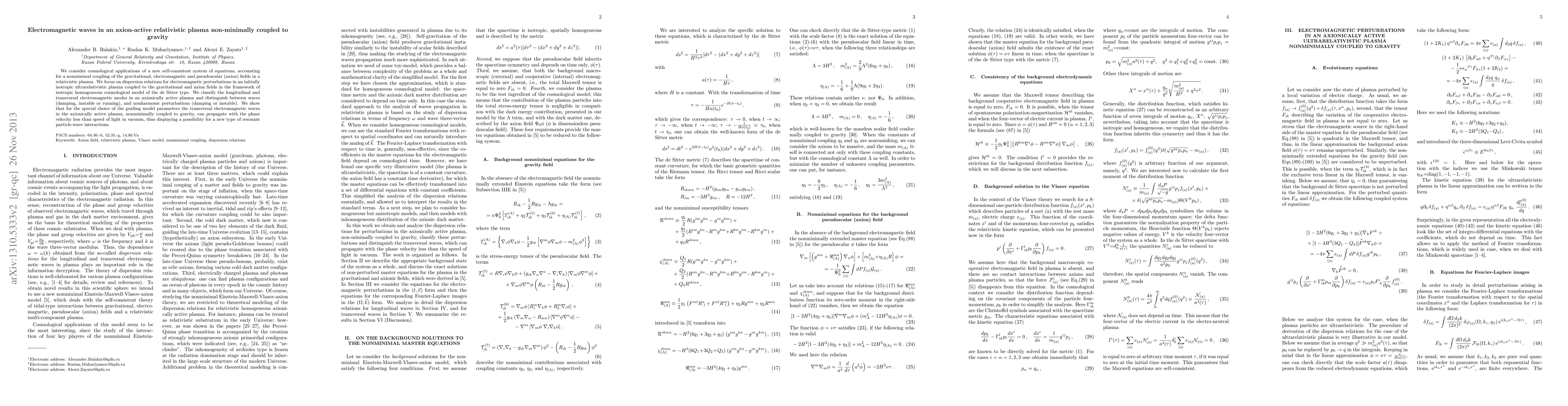 We consider cosmological applications of a new self-consistent system of equations, accounting for a nonminimal coupling of the gravitational, electromagnetic and pseudoscalar (axion) fields in a relativistic plasma. We focus on dispersion relations for electromagnetic perturbations in an initially isotropic ultrarelativistic plasma coupled to the gravitational and axion fields in the framework of isotropic homogeneous cosmological model of the de Sitter type. We classify the longitudinal and transversal electromagnetic modes in an axionically active plasma and distinguish between waves (damping, instable or running), and nonharmonic perturbations (damping or instable). We show that for the special choice of the guiding model parameters the transversal electromagnetic waves in the axionically active plasma, nonminimally coupled to gravity, can propagate with the phase velocity less than speed of light in vacuum, thus displaying a possibility for a new type of resonant particle-wave interactions.