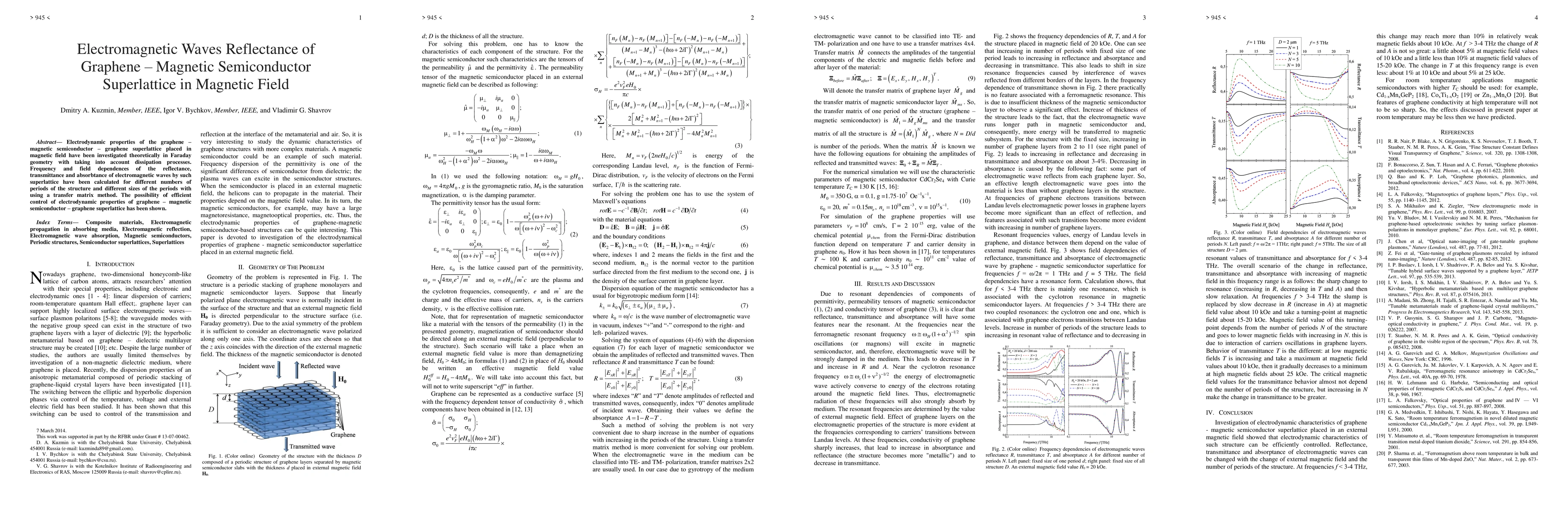 This paper investigates the electrodynamic properties of graphene-magnetic semiconductor-graphene superlattices in a magnetic field, revealing frequency and field dependences of reflectance, transmittance, and absorbtance using a transfer matrix method. The study demonstrates the potential for efficient control of these properties, highlighting their tunable electromagnetic wave interactions.