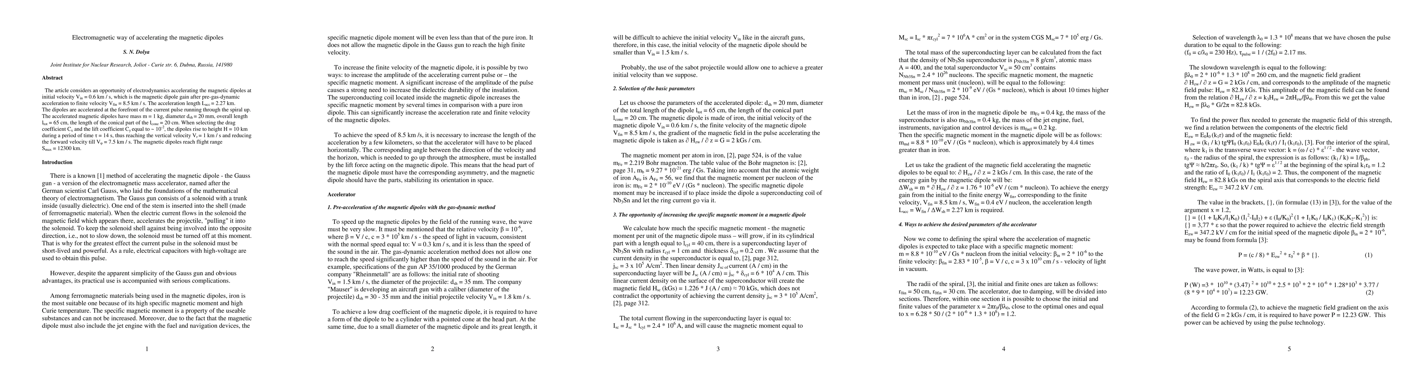 The research explores accelerating magnetic dipoles to high velocities using electromagnetic forces, following pre-gas-dynamic acceleration. With specific drag and lift coefficients, dipoles can reach 10 km in 14 seconds, attaining vertical velocity of 1 km/s and reducing forward velocity to 7.5 km/s, achieving a flight range of 12,300 km.