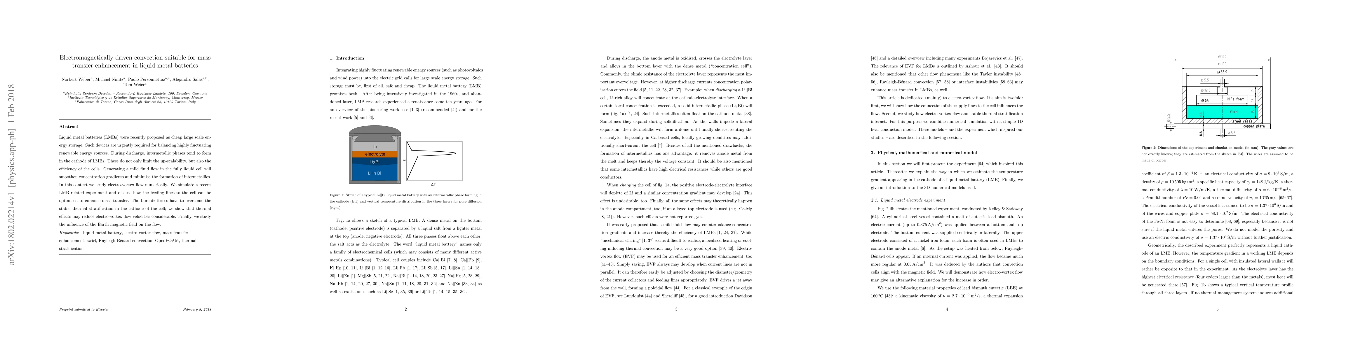 Liquid metal batteries (LMBs) were recently proposed as cheap large scale energy storage. Such devices are urgently required for balancing highly fluctuating renewable energy sources. During discharge, intermetallic phases tend to form in the cathode of LMBs. These do not only limit the up-scalability, but also the efficiency of the cells. Generating a mild fluid flow in the fully liquid cell will smoothen concentration gradients and minimise the formation of intermetallics. In this context we study electro-vortex flow numerically. We simulate a recent LMB related experiment and discuss how the feeding lines to the cell can be optimised to enhance mass transfer. The Lorentz forces have to overcome the stable thermal stratification in the cathode of the cell; we show that thermal effects may reduce electro-vortex flow velocities considerable. Finally, we study the influence of the Earth magnetic field on the flow.