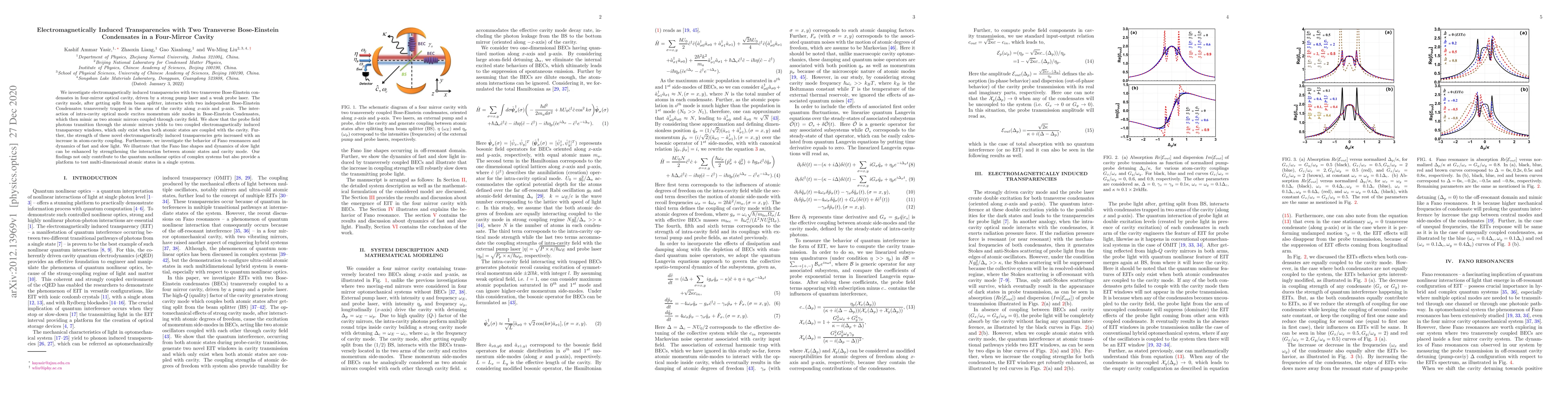 We investigate electromagnetically induced transparencies with two transverse Bose-Einstein condensates in four-mirror optical cavity, driven by a strong pump laser and a weak probe laser. The cavity mode, after getting split from beam splitter, interacts with two independent Bose-Einstein Condensates transversely trapped in the arms of the cavity along $x$-axis and $y$-axis. The interaction of intra-cavity optical mode excites momentum side modes in Bose-Einstein Condensates, which then mimic as two atomic mirrors coupled through cavity field. We show that the probe field photons transition through the atomic mirrors yields to two coupled electromagnetically induced transparency windows, which only exist when both atomic states are coupled with the cavity. Further, the strength of these novel electromagnetically induced transparencies gets increased with an increase in atom-cavity coupling. Furthermore, we investigate the behavior of Fano resonances and dynamics of fast and slow light. We illustrate that the Fano line shapes and dynamics of slow light can be enhanced by strengthening the interaction between atomic states and cavity mode. Our findings not only contribute to the quantum nonlinear optics of complex systems but also provide a platform to test multi-dimensional atomic states in a single system.