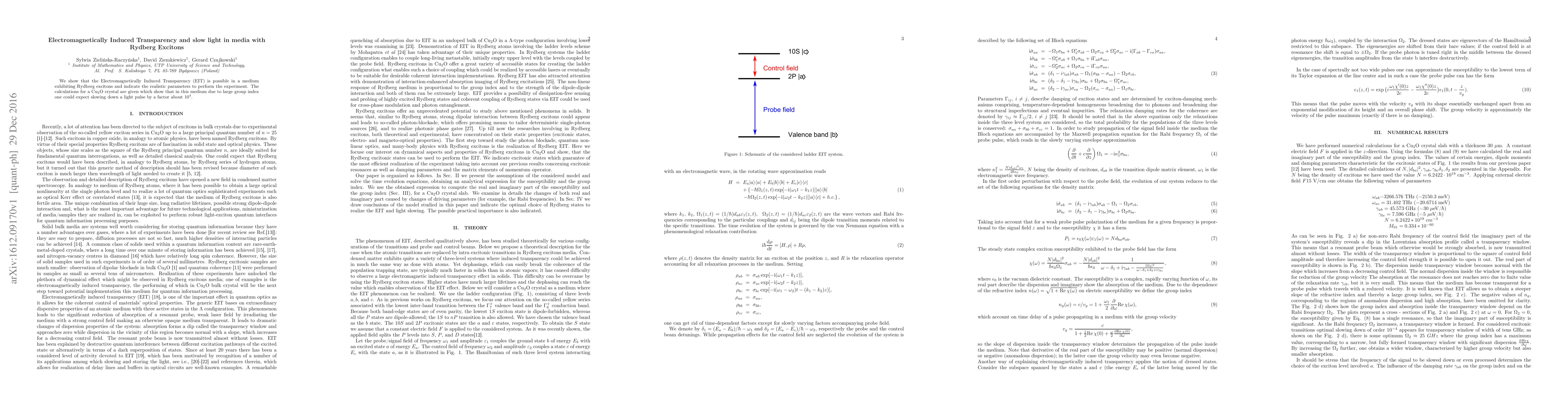 We show that the Electromagnetically Induced Transparency (EIT) is possible in a medium exhibiting Rydberg excitons and indicate the realistic parameters to perform the experiment. The calculations for a Cu$_2$O crystal are given which show that in this medium due to large group index one could expect slowing down a light pulse by a factor about $10^4$.
