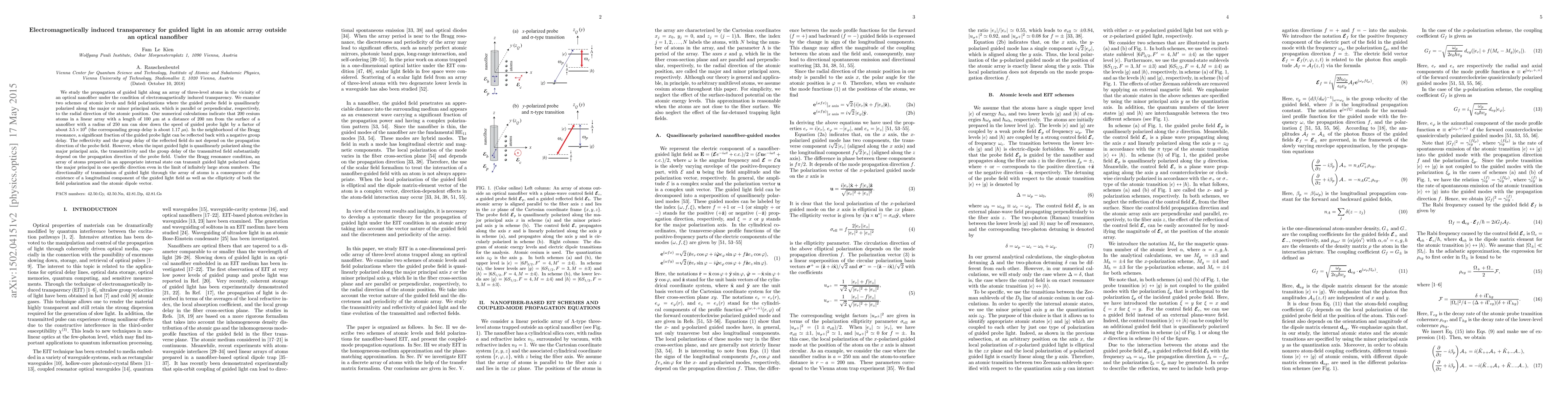 This paper investigates how electromagnetically induced transparency affects the propagation of guided light through a linear array of cesium atoms near an optical nanofiber. The study finds that such an array can drastically slow down guided light, achieving a slowdown factor of about $3.5\times 10^6$, and can reflect a significant fraction of the light under Bragg resonance conditions, with directionality in transmission dependent on polarization orientation.
