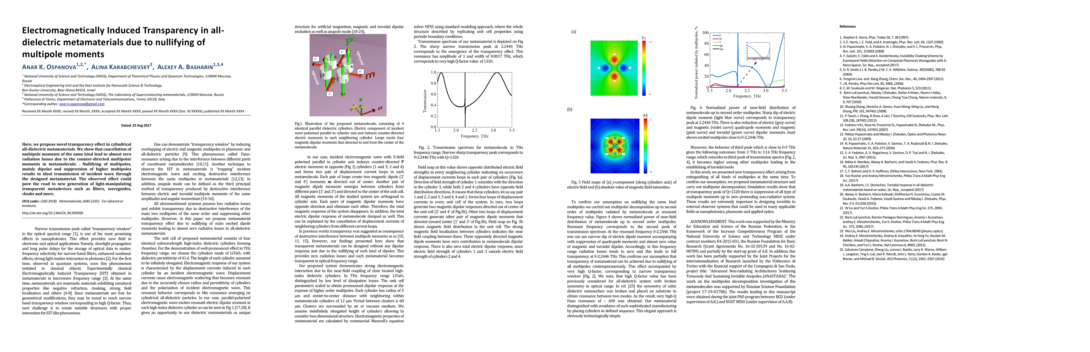 This paper proposes a novel electromagnetically induced transparency effect in all-dielectric metamaterials achieved by canceling multipole moments, leading to near-zero radiation losses and ideal transmission of incident waves. This transparency could enable new light-manipulating devices like filters and cloaks.
