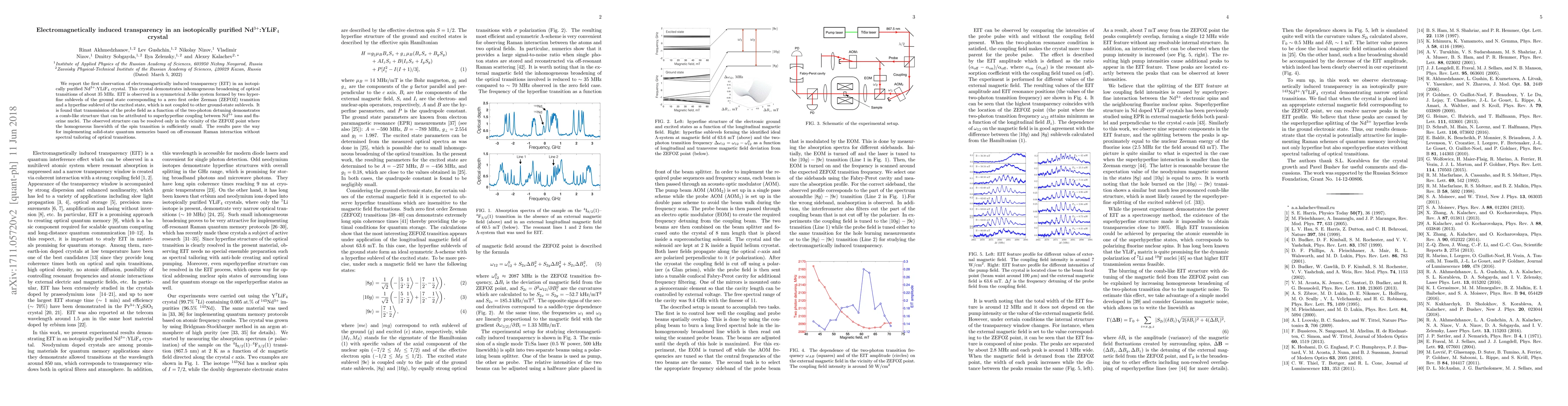 This paper reports the first observation of electromagnetically induced transparency (EIT) in an isotopically purified Nd$^{3+}$:YLiF$_4$ crystal, revealing a comb-like transmission structure due to superhyperfine coupling, which could enable solid-state quantum memories.