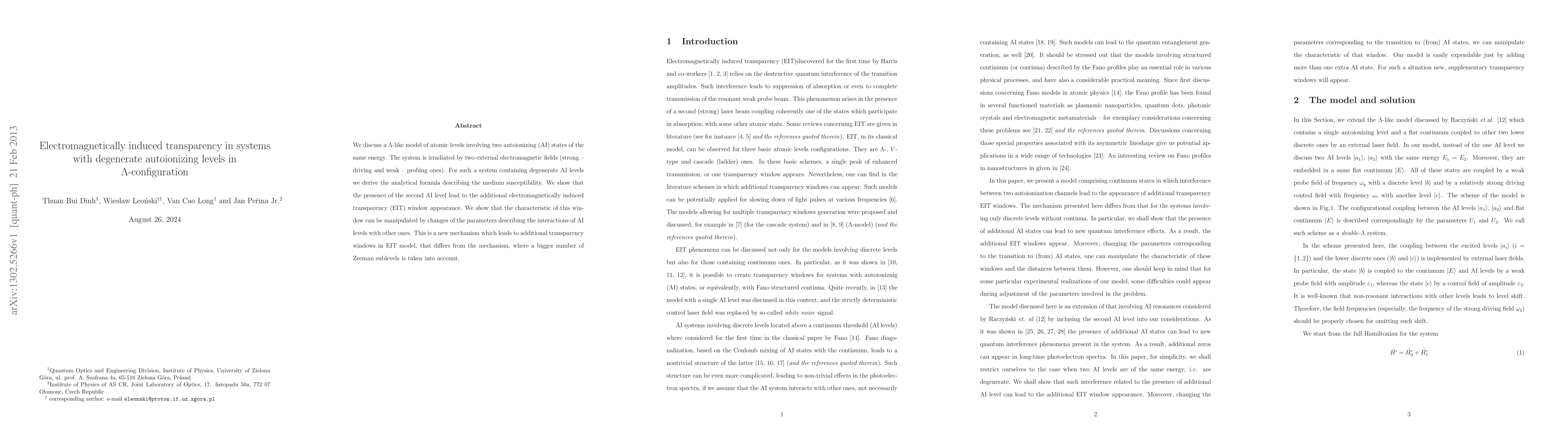We discuss a \Lambda-like model of atomic levels involving two autoionizing (AI) states of the same energy. The system is irradiated by two external electromagnetic fields (strong -- driving and weak -- probing ones). For such a system containing degenerate AI levels we derive the analytical formula describing the medium susceptibility. We show that the presence of the second AI level lead to the additional electromagnetically induced transparency (EIT) window appearance. We show that the characteristic of this window can be manipulated by changes of the parameters describing the interactions of AI levels with other ones. This is a new mechanism which leads to additional transparency windows in EIT model, that differs from the mechanism, where a bigger number of Zeeman sublevels is taken into account.