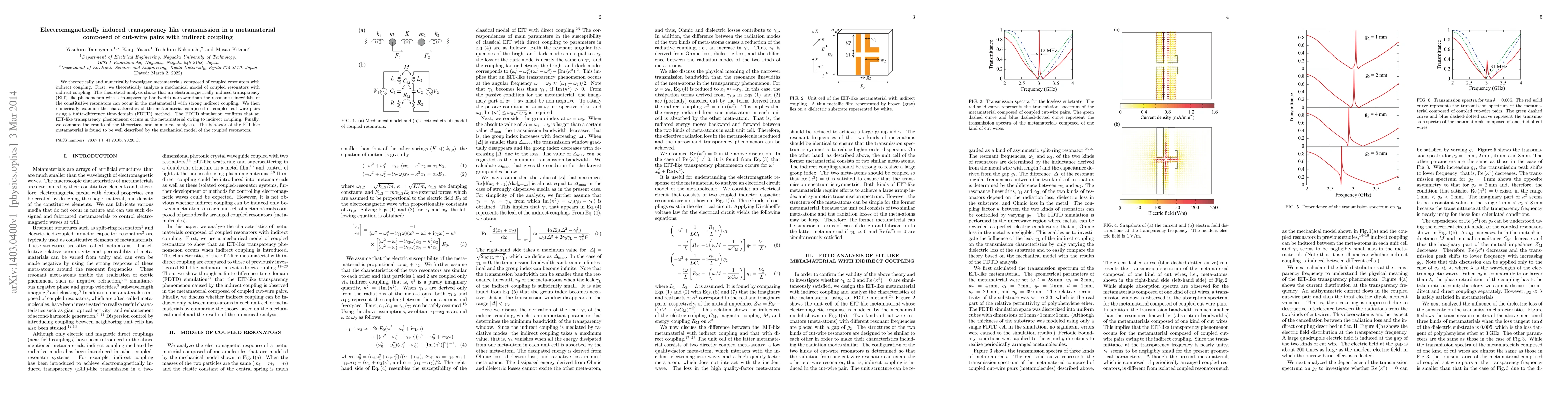 This paper investigates metamaterials made of coupled cut-wire pairs with indirect coupling, demonstrating an electromagnetically induced transparency (EIT)-like phenomenon through theoretical and numerical analysis. The study shows that the EIT-like transparency bandwidth is narrower than the individual resonator linewidths, confirmed by finite-difference time-domain simulations.