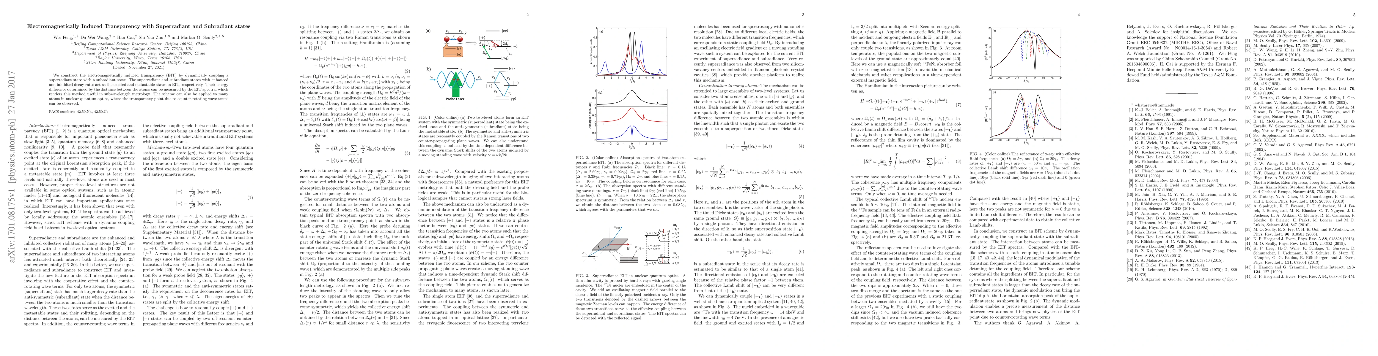 This paper constructs electromagnetically induced transparency (EIT) by coupling superradiant and subradiant states, with the energy difference between them measurable via EIT spectra, useful for subwavelength metrology. The scheme is also applicable in nuclear quantum optics for observing transparency points due to counter-rotating wave terms.