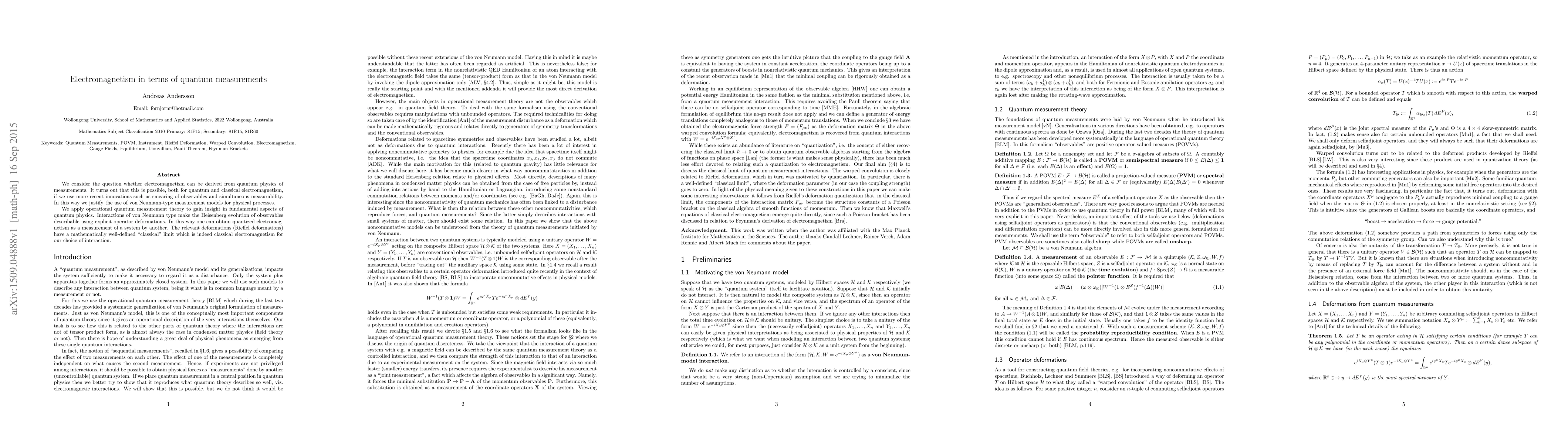 We consider the question whether electromagnetism can be derived from quantum physics of measurements. It turns out that this is possible, both for quantum and classical electromagnetism, if we use more recent innovations such as smearing of observables and simultaneous measurability. In this way we justify the use of von Neumann-type measurement models for physical processes. We apply operational quantum measurement theory to gain insight in fundamental aspects of quantum physics. Interactions of von Neumann type make the Heisenberg evolution of observables describable using explicit operator deformations. In this way one can obtain quantized electromagnetism as a measurement of a system by another. The relevant deformations (Rieffel deformations) have a mathematically well-defined "classical" limit which is indeed classical electromagnetism for our choice of interaction.