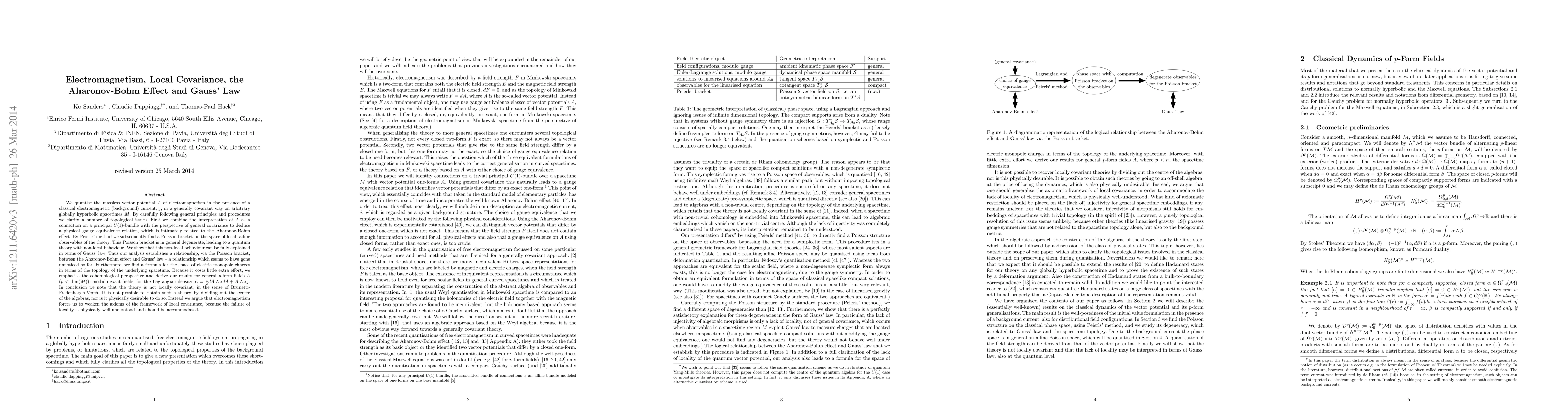 We quantise the massless vector potential A of electromagnetism in the presence of a classical electromagnetic (background) current, j, in a generally covariant way on arbitrary globally hyperbolic spacetimes M. By carefully following general principles and procedures we clarify a number of topological issues. First we combine the interpretation of A as a connection on a principal U(1)-bundle with the perspective of general covariance to deduce a physical gauge equivalence relation, which is intimately related to the Aharonov-Bohm effect. By Peierls' method we subsequently find a Poisson bracket on the space of local, affine observables of the theory. This Poisson bracket is in general degenerate, leading to a quantum theory with non-local behaviour. We show that this non-local behaviour can be fully explained in terms of Gauss' law. Thus our analysis establishes a relationship, via the Poisson bracket, between the Aharonov-Bohm effect and Gauss' law (a relationship which seems to have gone unnoticed so far). Furthermore, we find a formula for the space of electric monopole charges in terms of the topology of the underlying spacetime. Because it costs little extra effort, we emphasise the cohomological perspective and derive our results for general p-form fields A (p < dim(M)), modulo exact fields. In conclusion we note that the theory is not locally covariant, in the sense of Brunetti-Fredenhagen-Verch. It is not possible to obtain such a theory by dividing out the centre of the algebras, nor is it physically desirable to do so. Instead we argue that electromagnetism forces us to weaken the axioms of the framework of local covariance, because the failure of locality is physically well-understood and should be accommodated.