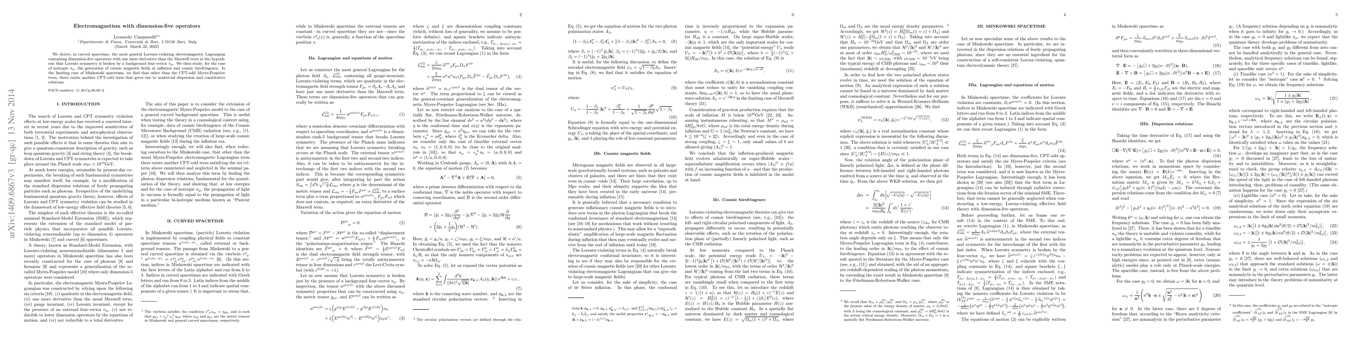 This paper derives the most general Lorentz-violating electromagnetic Lagrangian in curved spacetime with dimension-five operators, exploring their implications for cosmic magnetic fields and birefringence. It identifies a new CPT-odd term in flat spacetime that affects dispersion and constitutive relations.