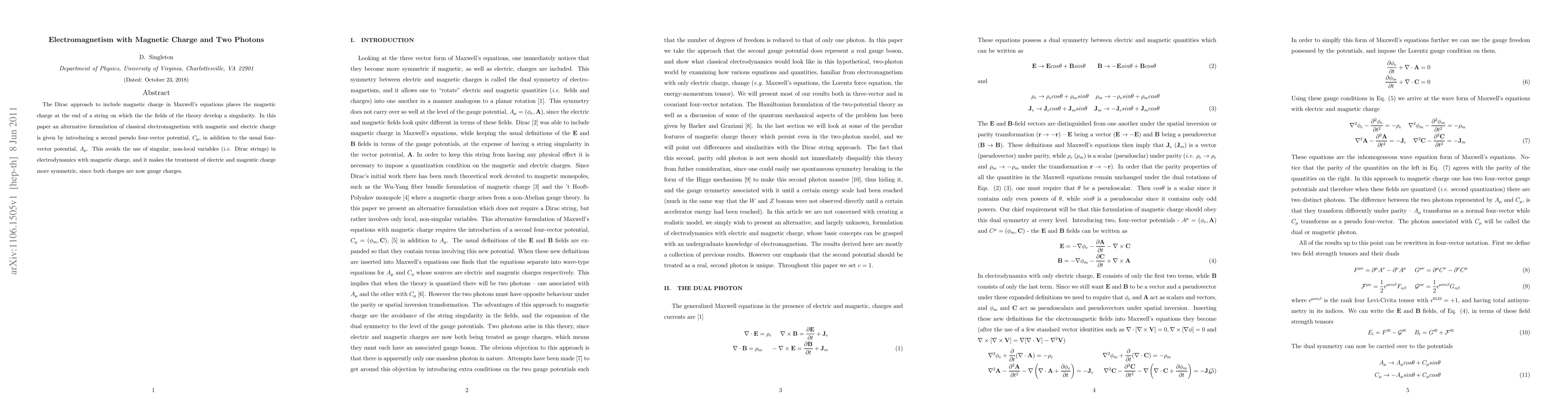 This paper proposes an alternative formulation of classical electromagnetism incorporating both magnetic and electric charge by introducing a second pseudo four-vector potential, C_mu, alongside the usual four-vector potential, A_mu, thus avoiding the use of singular, non-local variables like Dirac strings and achieving greater symmetry in the treatment of both charge types.