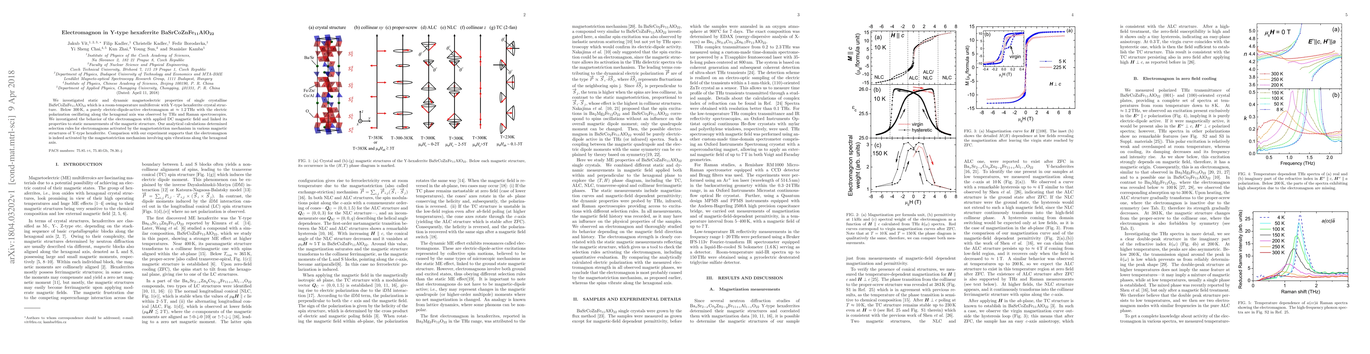 This study investigates the magnetoelectric properties of Y-type hexaferrite BaSrCoZnFe$_{11}$AlO$_{22}$, identifying an electromagnon at $1.2\,\rm THz$ below $300\,\rm K$ activated by magnetostriction. The research links electromagnon behavior to magnetic structure and validates its mechanism through theoretical calculations and experimental observations.