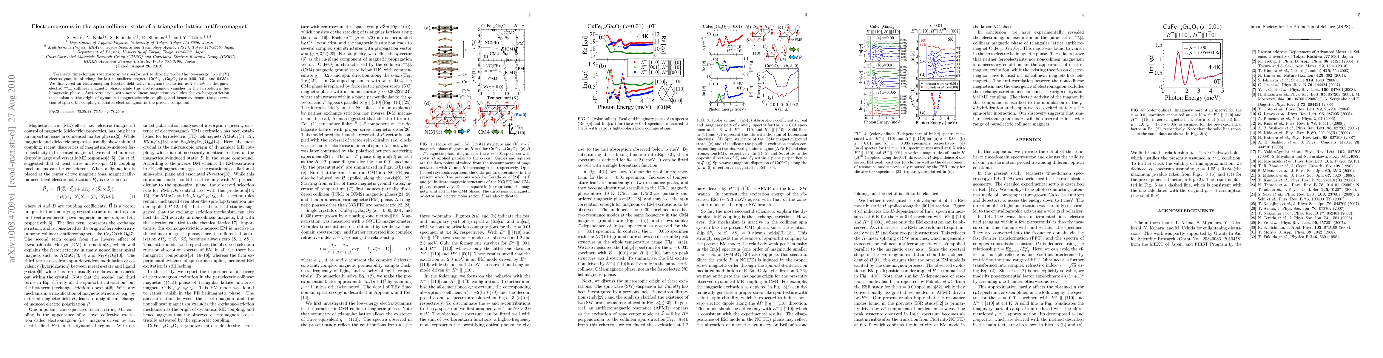 Terahertz time-domain spectroscopy was performed to directly probe the low-energy (1-5 meV) electrodynamics of triangular lattice antiferromagnets CuFe1-xGaxO2 (x = 0.00, 0.01, and 0.035). We discovered an electromagnon (electric-field-active magnon) excitation at 2.3 meV in the paraelectric up-up-down-down collinear magnetic phase, while this electromagnon vanishes in the ferroelectric helimagnetic phase. Anti-correlation with noncollinear magnetism excludes the exchange-striction mechanism as the origin of dynamical magnetoelectric coupling, and hence evidences the observation of spin-orbit coupling mediated electromagnon in the present compound.