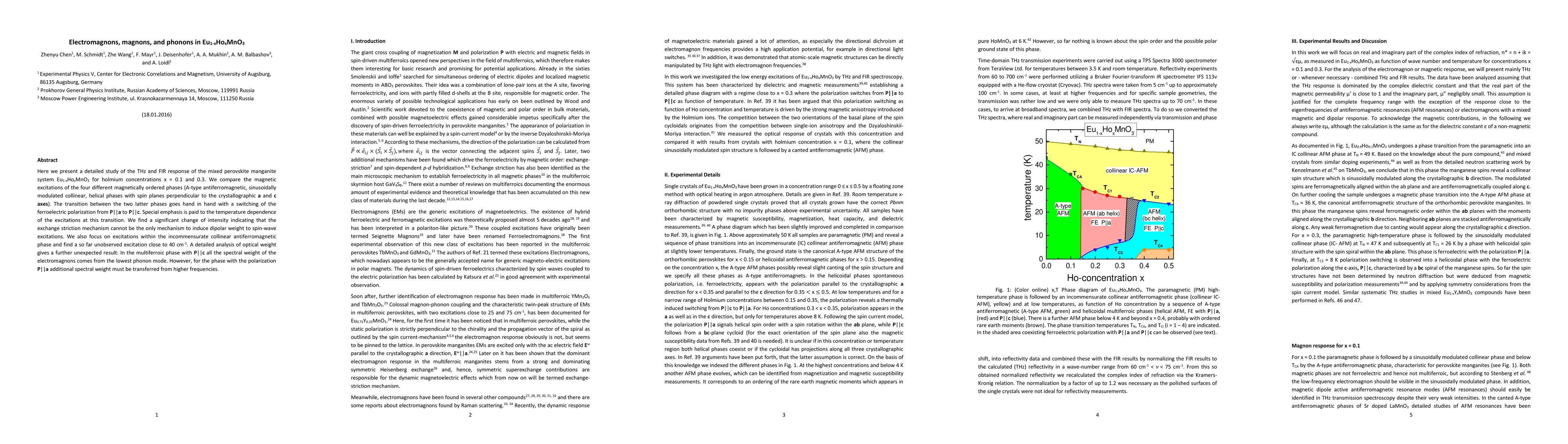 Here we present a detailed study of the THz and FIR response of the mixed perovskite manganite system Eu$_{1-x}$Ho$_x$MnO$_3$ for holmium concentrations x = 0.1 and 0.3. We compare the magnetic excitations of the four different magnetically ordered phases (A-type antiferromagnetic, sinusoidally modulated collinear, helical phases with spin planes perpendicular to the crystallographic a and c axes). The transition between the two latter phases goes hand in hand with a switching of the ferroelectric polarization from P||a to P||c. Special emphasis is paid to the temperature dependence of the excitations at this transition. We find a significant change of intensity indicating that the exchange striction mechanism cannot be the only mechanism to induce dipolar weight to spin-wave excitations. We also focus on excitations within the incommensurate collinear antiferromagnetic phase and find a so far unobserved excitation close to 40 cm$^{-1}$. A detailed analysis of optical weight gives a further unexpected result: In the multiferroic phase with P||c all the spectral weight of the electromagnons comes from the lowest phonon mode. However, for the phase with the polarization P||a additional spectral weight must be transferred from higher frequencies.