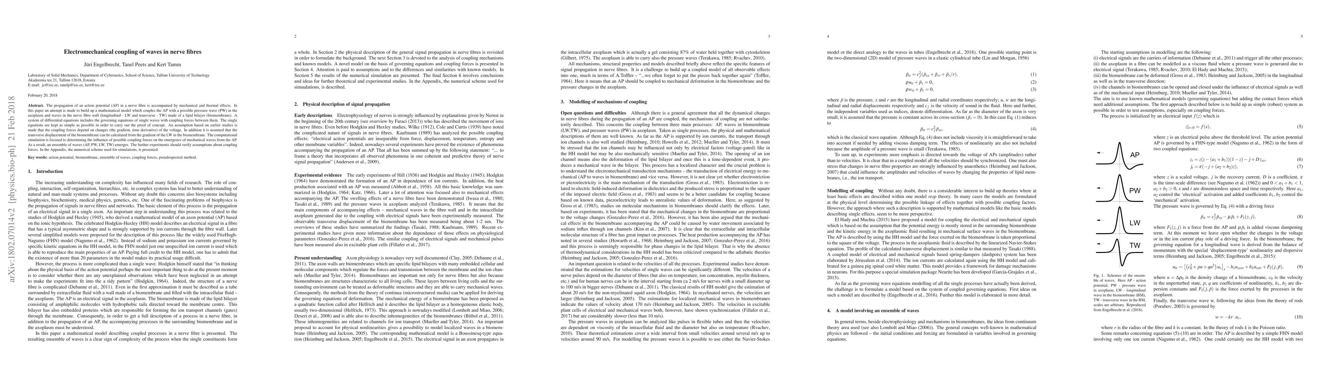 This paper develops a mathematical model to describe the electromechanical coupling of waves in nerve fibres, linking action potentials with pressure waves and longitudinal and transverse waves in the nerve fibre wall. The model uses differential equations to represent these interactions, with assumptions about voltage-dependent coupling forces, and aims to determine the influence of these forces on the emergence of mechanical waves.