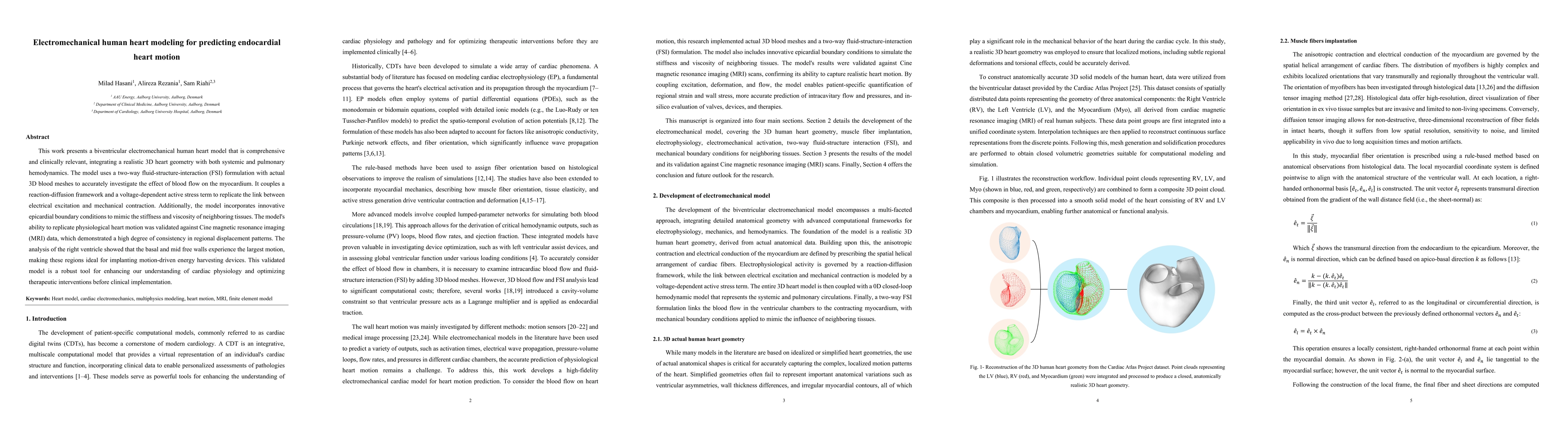 This work presents a biventricular electromechanical human heart model that is comprehensive and clinically relevant, integrating a realistic 3D heart geometry with both systemic and pulmonary hemodynamics. The model uses a two-way fluid-structure-interaction (FSI) formulation with actual 3D blood meshes to accurately investigate the effect of blood flow on the myocardium. It couples a reaction-diffusion framework and a voltage-dependent active stress term to replicate the link between electrical excitation and mechanical contraction. Additionally, the model incorporates innovative epicardial boundary conditions to mimic the stiffness and viscosity of neighboring tissues. The model's ability to replicate physiological heart motion was validated against Cine magnetic resonance imaging (MRI) data, which demonstrated a high degree of consistency in regional displacement patterns. The analysis of the right ventricle showed that the basal and mid free walls experience the largest motion, making these regions ideal for implanting motion-driven energy harvesting devices. This validated model is a robust tool for enhancing our understanding of cardiac physiology and optimizing therapeutic interventions before clinical implementation.