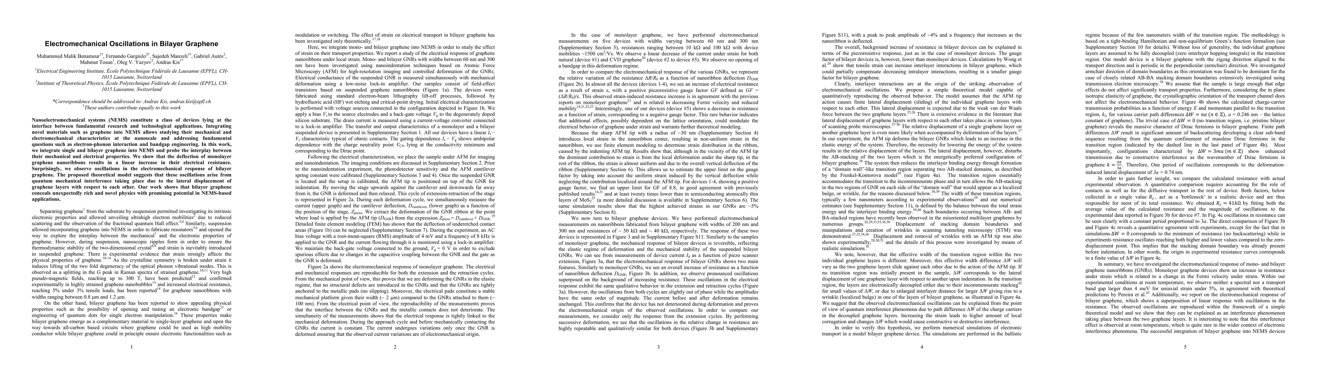 This research explores the integration of graphene into nanoelectromechanical systems (NEMS), revealing that while monolayer graphene nanoribbons show a linear increase in resistance with deflection, bilayer graphene exhibits surprising electromechanical oscillations due to quantum mechanical interference effects. These findings highlight novel physics in bilayer graphene with potential applications in NEMS.