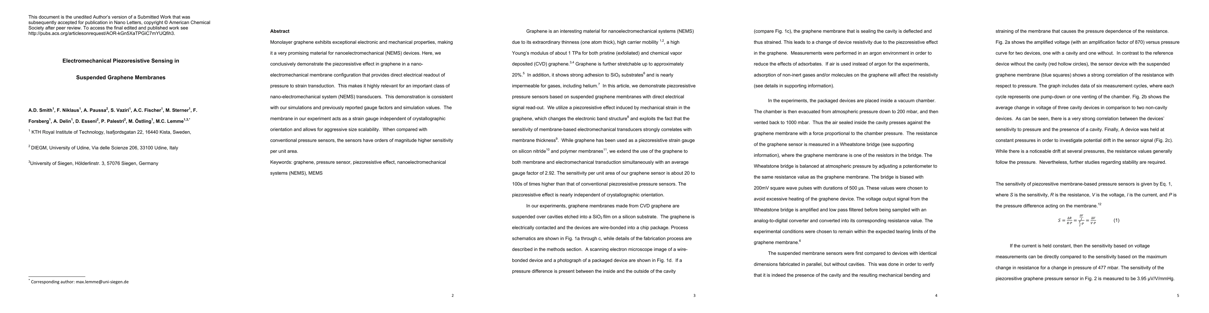 This paper demonstrates piezoresistive sensing in suspended graphene membranes, showcasing a high sensitivity nano-electromechanical system (NEMS) transducer with superior sensitivity over conventional sensors. The graphene membrane functions as a strain gauge, independent of orientation, and supports scalability.