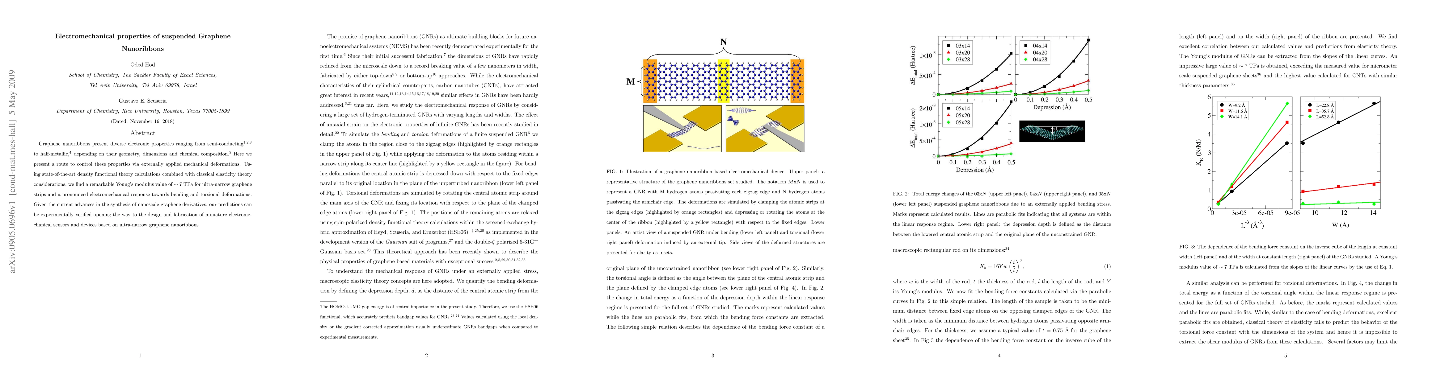 This study explores the electromechanical properties of suspended graphene nanoribbons, revealing a Young's modulus of ~7 TPa and significant electromechanical responses to deformations. Theoretical and computational methods predict these properties, suggesting potential applications in creating advanced sensors and devices.