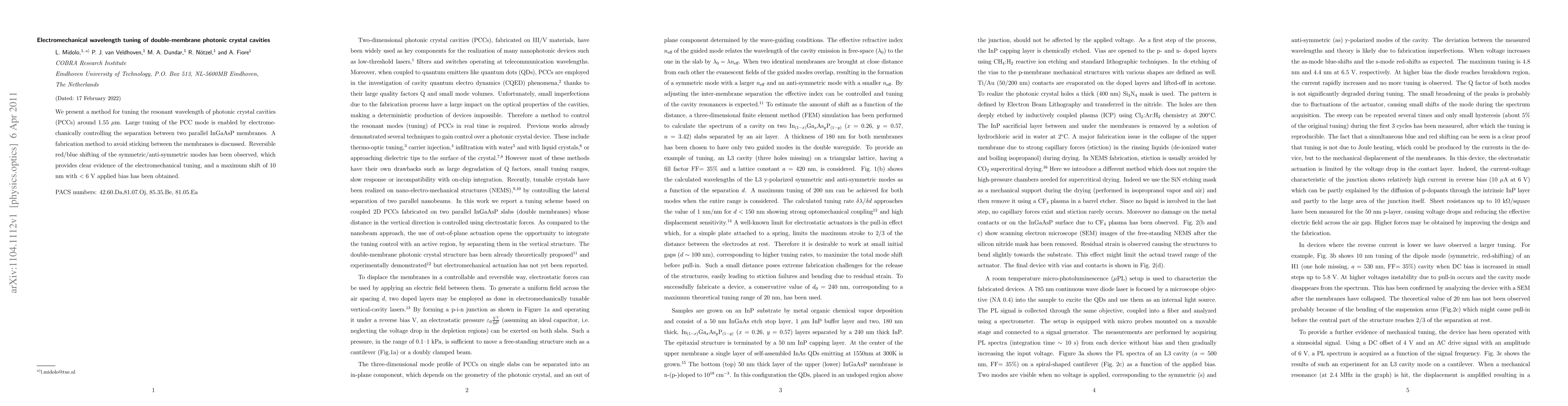 The research introduces a method to tune the resonant wavelength of photonic crystal cavities around 1.55 micrometers using electromechanical control of InGaAsP membrane separation. A fabrication technique to prevent membrane sticking is discussed, and the method demonstrates a maximum shift of 10 nm with less than 6 volts applied bias, showing reversible red/blue shifting of symmetric/anti-symmetric modes.