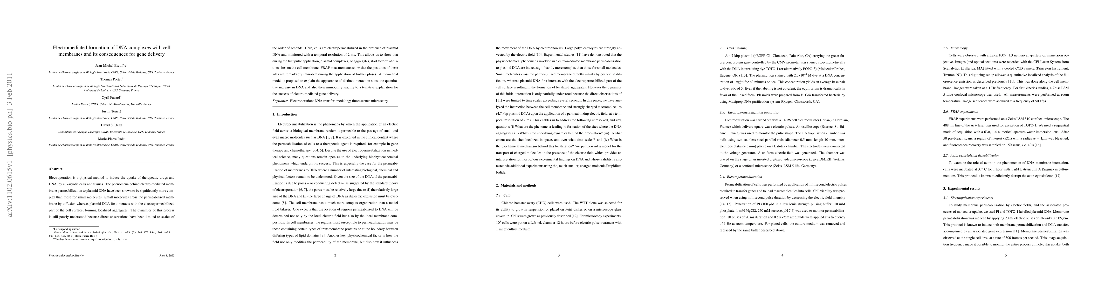 Electroporation is a physical method to induce the uptake of therapeutic drugs and DNA, by eukaryotic cells and tissues. The phenomena behind electro-mediated membrane permeabilization to plasmid DNA have been shown to be significantly more complex than those for small molecules. Small molecules cross the permeabilized membrane by diffusion whereas plasmid DNA first interacts with the electropermeabilized part of the cell surface, forming localized aggregates. The dynamics of this process is still poorly understood because direct observations have been limited to scales of the order of seconds. Here, cells are electropermeabilized in the presence of plasmid DNA and monitored with a temporal resolution of 2 ms. This allows us to show that during the first pulse application, plasmid complexes, or aggregates, start to form at distinct sites on the cell membrane. FRAP measurements show that the positions of these sites are remarkably immobile during the application of further pluses. A theoretical model is proposed to explain the appearance of distinct interaction sites, the quantitative increase in DNA and also their immobility leading to a tentative explanation for the success of electro-mediated gene delivery.