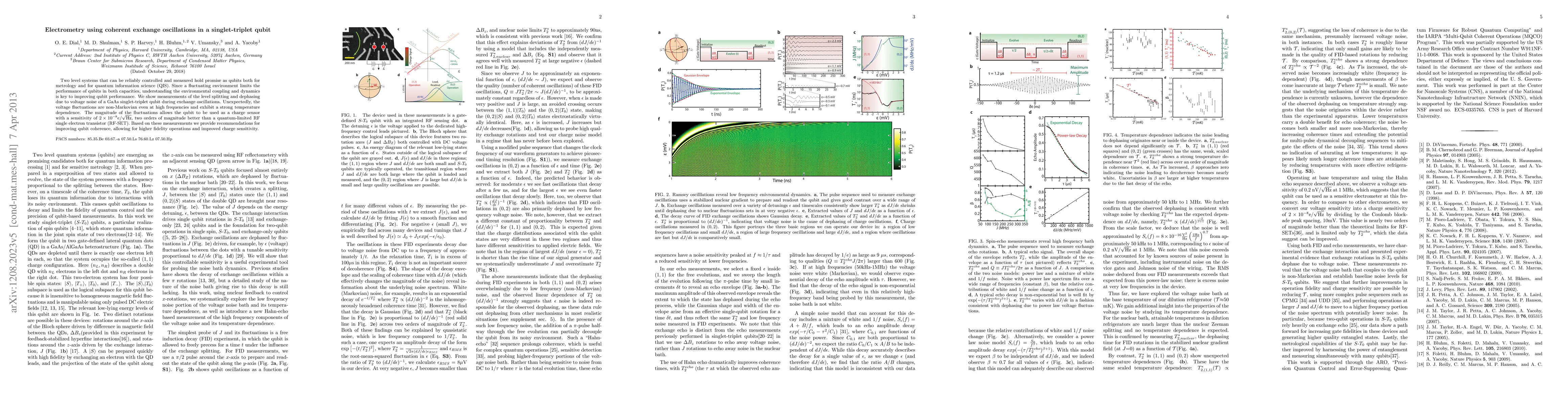 Two level systems that can be reliably controlled and measured hold promise in both metrology and as qubits for quantum information science (QIS). When prepared in a superposition of two states and allowed to evolve freely, the state of the system precesses with a frequency proportional to the splitting between the states. In QIS,this precession forms the basis for universal control of the qubit,and in metrology the frequency of the precession provides a sensitive measurement of the splitting. However, on a timescale of the coherence time, $T_2$, the qubit loses its quantum information due to interactions with its noisy environment, causing qubit oscillations to decay and setting a limit on the fidelity of quantum control and the precision of qubit-based measurements. Understanding how the qubit couples to its environment and the dynamics of the noise in the environment are therefore key to effective QIS experiments and metrology. Here we show measurements of the level splitting and dephasing due to voltage noise of a GaAs singlet-triplet qubit during exchange oscillations. Using free evolution and Hahn echo experiments we probe the low frequency and high frequency environmental fluctuations, respectively. The measured fluctuations at high frequencies are small, allowing the qubit to be used as a charge sensor with a sensitivity of $2 \times 10^{-8} e/\sqrt{\mathrm{Hz}}$, two orders of magnitude better than the quantum limit for an RF single electron transistor (RF-SET). We find that the dephasing is due to non-Markovian voltage fluctuations in both regimes and exhibits an unexpected temperature dependence. Based on these measurements we provide recommendations for improving $T_2$ in future experiments, allowing for higher fidelity operations and improved charge sensitivity.