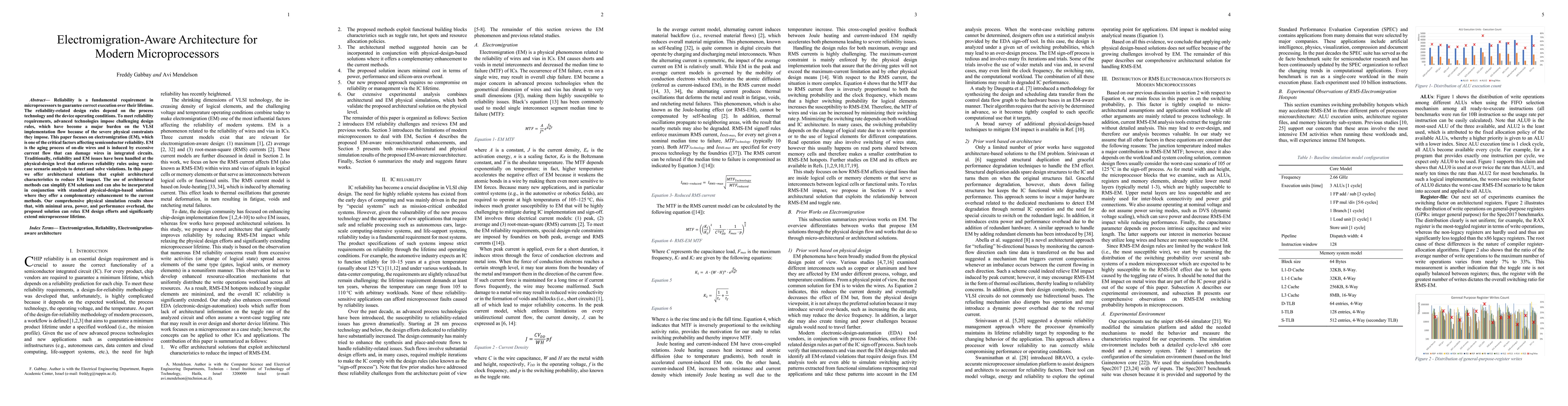 Reliability is a fundamental requirement in any microprocessor to guarantee correct execution over its lifetime. The design rules related to reliability depend on the process technology being used and the expected operating conditions of the device. To meet reliability requirements, advanced process technologies (28 nm and below) impose highly challenging design rules. Such design-for-reliability rules have become a major burden on the flow of VLSI implementation because of the severe physical constraints they impose. This paper focuses on electromigration (EM), which is one of the major critical factors affecting semiconductor reliability. EM is the aging process of on-die wires and vias and is induced by excessive current flow that can damage wires and may also significantly impact the integrated-circuit clock frequency. EM exerts a comprehensive global effect on devices because it impacts wires that may reside inside the standard or custom logical cells, between logical cells, inside memory elements, and within wires that interconnect functional blocks. The design-implementation flow (synthesis and place-and-route) currently detects violations of EM-reliability rules and attempts to solve them. In contrast, this paper proposes a new approach to enhance these flows by using EM-aware architecture. Our results show that the proposed solution can relax EM design efforts in microprocessors and more than double microprocessor lifetime. This work demonstrates this proposed approach for modern microprocessors, although the principals and ideas can be adapted to other cases as well.