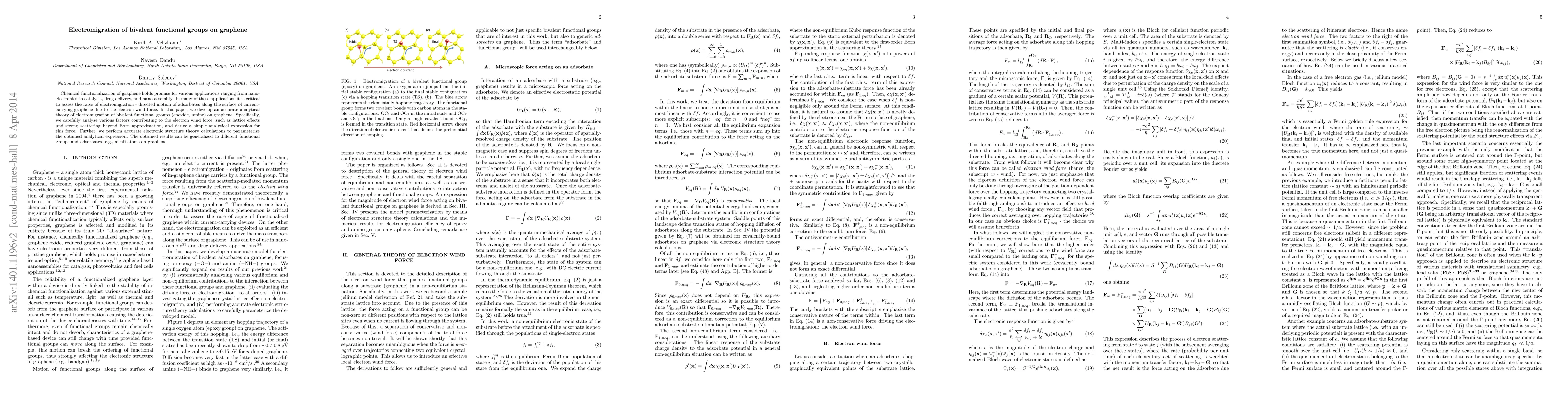 This paper develops an analytical theory for electromigration of bivalent functional groups on graphene, analyzing factors like lattice effects and strong scattering. It provides an expression for the electron wind force and uses electronic structure calculations to parameterize it, offering a generalizable model for various functional groups and adsorbates.